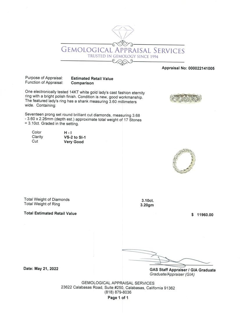 Appraisal No: 000022141005 One electronically tested 14KT white gold lady's cast fashion eternity ring with a bright polish finish. Condition is new, good workmanship. The featured lady's ring has a shank measuring 3.60 millimeters wide. Containing: Se
