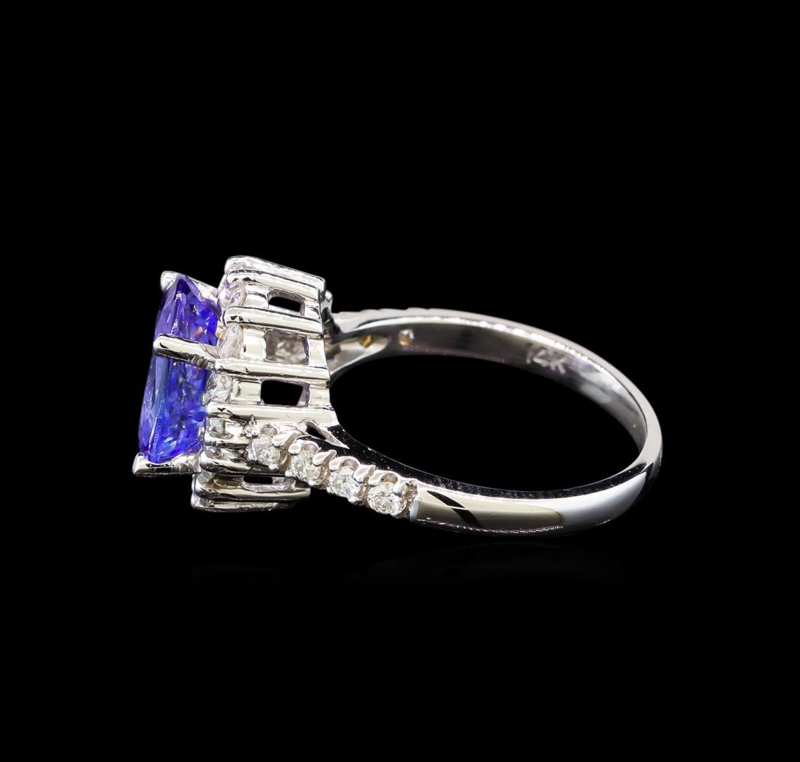 One electronically tested 14KT white gold ladies cast tanzanite and diamond ring with a bright polish finish. Identified with markings of "K14". Condition is new. Containing: One prong set oval modified brilliant cut natural tanzanite, measuring 10.60 x 8.00 x 5.20mm, approximate weight of 3.10ct., clarity is eye clean, type I, medium light, very slightly grayish, violet color, (GIA V 4/3), cut is good. Twenty-Two prong set round brilliant cut diamonds, measuring 2.00 - 1.50 x 1.05mm (depth est.) approximate total weight of 22 Stones = 0.43ct. Clarity: SI-1 to SI-2. Color: H - I, Cut is Good. Colored gemstones are presumed to have been subjected to commonly used enhancement processes. All diamonds and colored gemstones are graded in the mounting, unless otherwise stated. Total Weight of Colored Stones 3.10ct. Total Weight of Diamonds 0.43ct. Total Weight of Ring 5.30 grams. GGL Appraised at $4,355.00.