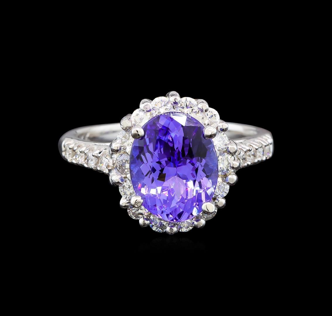 One electronically tested 14KT white gold ladies cast tanzanite and diamond ring with a bright polish finish. Identified with markings of "K14". Condition is new. Containing: One prong set oval modified brilliant cut natural tanzanite, measuring 10.60 x 8.00 x 5.20mm, approximate weight of 3.10ct., clarity is eye clean, type I, medium light, very slightly grayish, violet color, (GIA V 4/3), cut is good. Twenty-Two prong set round brilliant cut diamonds, measuring 2.00 - 1.50 x 1.05mm (depth est.) approximate total weight of 22 Stones = 0.43ct. Clarity: SI-1 to SI-2. Color: H - I, Cut is Good. Colored gemstones are presumed to have been subjected to commonly used enhancement processes. All diamonds and colored gemstones are graded in the mounting, unless otherwise stated. Total Weight of Colored Stones 3.10ct. Total Weight of Diamonds 0.43ct. Total Weight of Ring 5.30 grams. GGL Appraised at $4,355.00.