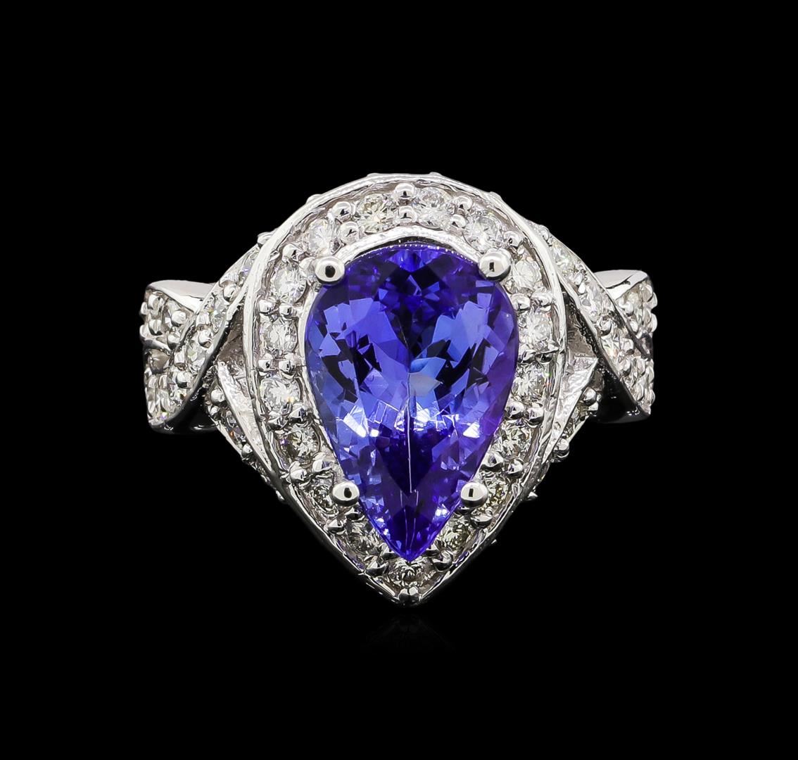 One electronically tested 14KT white gold ladies cast tanzanite and diamond ring with a bright polish finish. Identified with markings of "K14". Condition is new. Containing: One prong set oval modified brilliant cut natural tanzanite, measuring 10.10 x 7.80 x 5.60mm, approximate weight of 3.10ct., clarity is eye clean, type I, medium light, very slightly grayish, violet color, (GIA V 4/3), cut is good. Fifty-Three prong set round brilliant cut diamonds, measuring 1.50 - 1.50 x 0.90mm (depth est.) approximate total weight of 53 Stones = 0.65ct. Clarity: SI-2 to I-1. Color: I - J, Cut is Good. Colored gemstones are presumed to have been subjected to commonly used enhancement processes. All diamonds and colored gemstones are graded in the mounting, unless otherwise stated. Total Weight of Colored Stones 3.10ct. Total Weight of Diamonds 0.65ct. Total Weight of Ring 9.20 grams. GGL Appraised at $5,940.00.