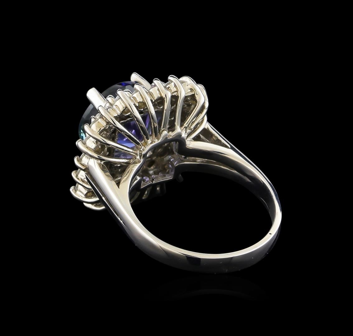One electronically tested 14KT white gold ladies combination cast & assembled tanzanite and diamond ring with a flat shank with a bright polish finish. Identified with markings of "K14". Condition is new. Containing: One prong set round modified brilliant cut natural tanzanite, measuring 8.94 - 8.90 x 5.80 mm, approximate weight of 3.11ct., clarity is eye clean, type I, medium light, moderately strong, violet color, (GIA V 4/4), cut is good. Forty prong set round brilliant cut diamonds, measuring 1.80 - 1.60 x 1.02mm (depth est.) approximate total weight of 40 Stones = 0.72ct. Clarity: I-1 to I-2. Color: I - J, Cut is Good. Colored gemstones are presumed to have been subjected to commonly used enhancement processes. All diamonds and colored gemstones are graded in the mounting, unless otherwise stated. Total Weight of Colored Stones 3.11ct. Total Weight of Diamonds 0.72ct. Total Weight of Ring 6.70 grams. GGL Appraised at $8,240.00.