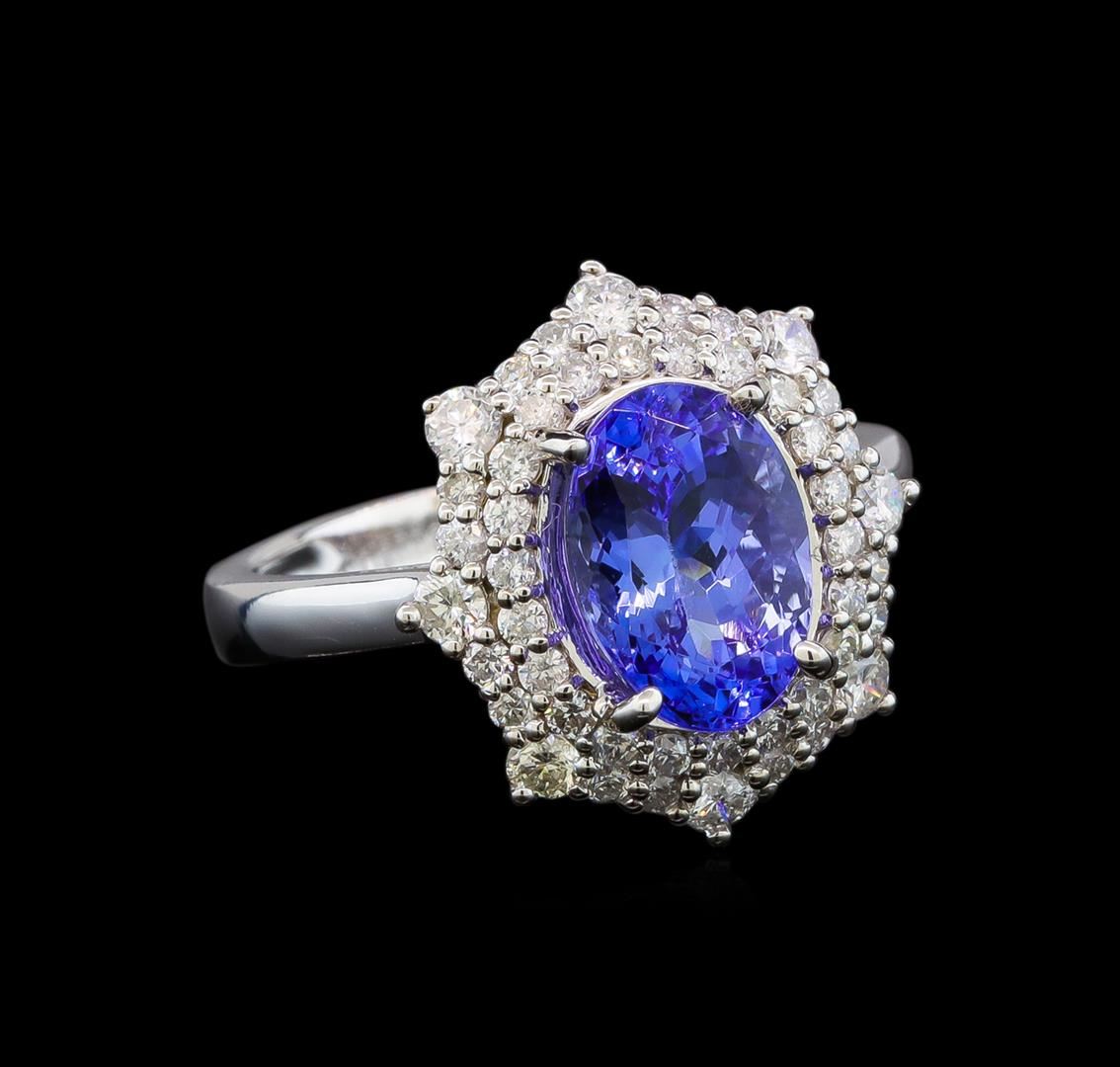 One electronically tested 14KT white gold ladies cast tanzanite and diamond ring with a bright polish finish. Identified with markings of "14K". Condition is new. Containing: One prong set oval modified brilliant cut natural tanzanite, measuring 10.00 x 7.50 x 5.90mm, approximate weight of 3.11ct., clarity is eye clean, type I, medium light, very slightly grayish, violet color, (GIA V 4/3), cut is good. Forty-Six prong set round brilliant cut diamonds, measuring 1.90 - 1.30 x 0.96mm (depth est.) approximate total weight of 46 Stones = 0.50ct. Clarity: SI-2 to I-2. Color: I - J, Cut is Good. Colored gemstones are presumed to have been subjected to commonly used enhancement processes. All diamonds and colored gemstones are graded in the mounting, unless otherwise stated. Total Weight of Colored Stones 3.11ct. Total Weight of Diamonds 0.50ct. Total Weight of Ring 6.75 grams. GGL Appraised at $4,840.00.