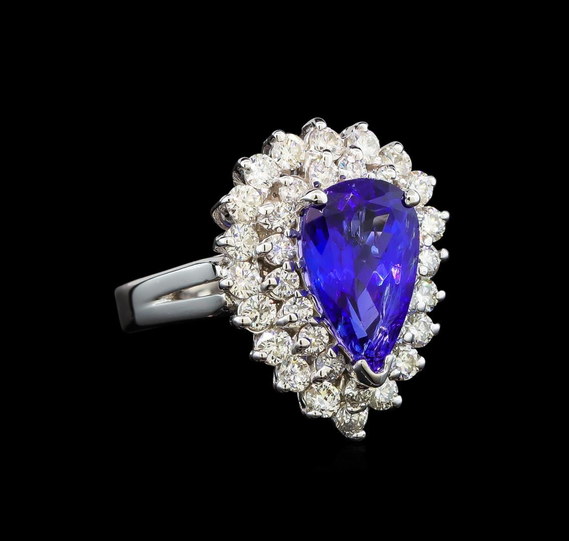 One electronically tested 14KT white gold ladies cast tanzanite and diamond ring with a bright polish finish. Identified with markings of "14K". Condition is new. Containing: One prong set pear modified brilliant cut natural tanzanite, measuring 11.86 x 7.51 x 5.21mm, approximate weight of 3.11ct., clarity is eye clean, type I, medium light, very slightly grayish, violet color, (GIA V 4/3), cut is good. Thirty-Seven prong set round brilliant cut diamonds, measuring 2.00 - 1.80 x 1.14mm (depth est.) approximate total weight of 37 Stones = 0.93ct. Clarity: SI-1 to SI-2. Color: I - J. Colored gemstones are presumed to have been subjected to commonly used enhancement processes. All diamonds and colored gemstones are graded in the mounting, unless otherwise stated. Total Weight of Colored Stones 3.11ct. Total Weight of Diamonds 0.93ct. Total Weight of Ring 6.70 grams. GGL Appraised at $5,820.00.