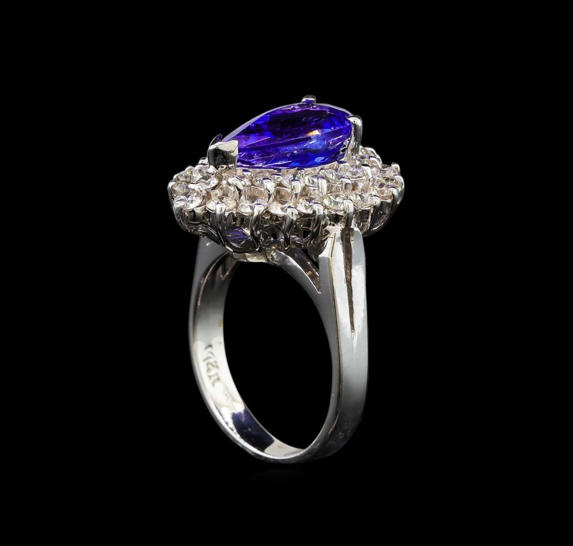 One electronically tested 14KT white gold ladies cast tanzanite and diamond ring with a bright polish finish. Identified with markings of "14K". Condition is new. Containing: One prong set pear modified brilliant cut natural tanzanite, measuring 11.86 x 7.51 x 5.21mm, approximate weight of 3.11ct., clarity is eye clean, type I, medium light, very slightly grayish, violet color, (GIA V 4/3), cut is good. Thirty-Seven prong set round brilliant cut diamonds, measuring 2.00 - 1.80 x 1.14mm (depth est.) approximate total weight of 37 Stones = 0.93ct. Clarity: SI-1 to SI-2. Color: I - J. Colored gemstones are presumed to have been subjected to commonly used enhancement processes. All diamonds and colored gemstones are graded in the mounting, unless otherwise stated. Total Weight of Colored Stones 3.11ct. Total Weight of Diamonds 0.93ct. Total Weight of Ring 6.70 grams. GGL Appraised at $5,820.00.