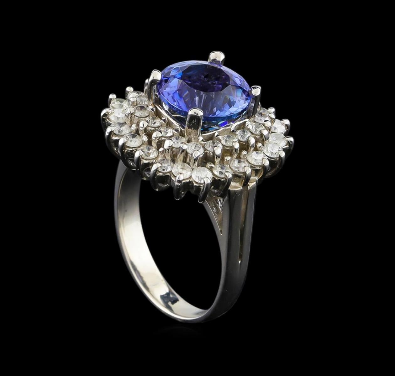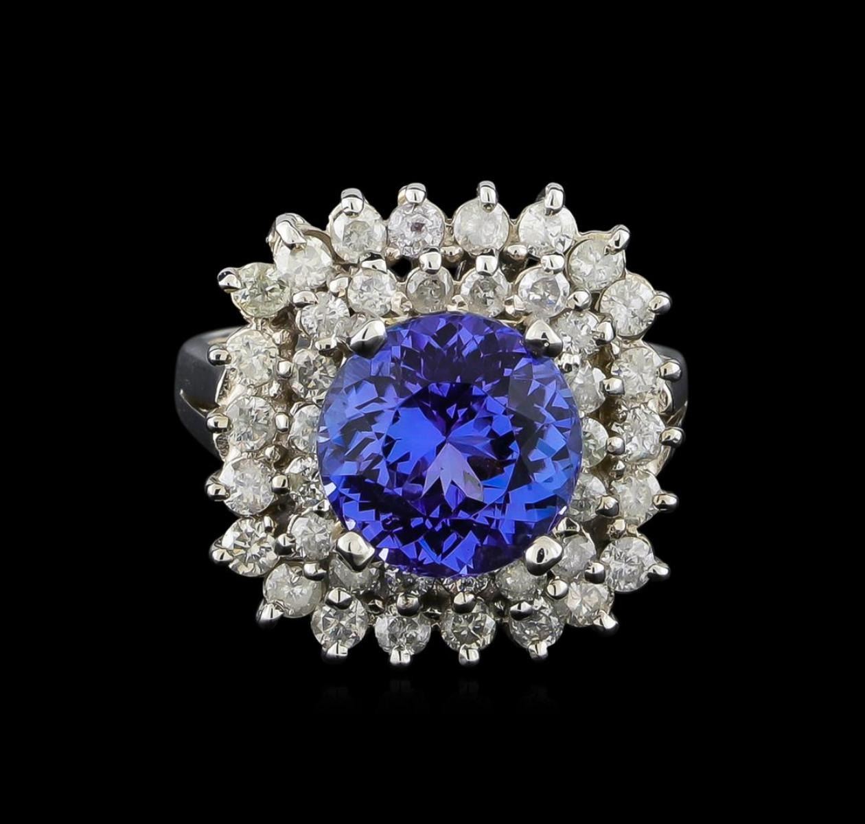 One electronically tested 14KT white gold ladies combination cast & assembled tanzanite and diamond ring with a flat shank with a bright polish finish. Identified with markings of "K14". Condition is new. Containing: One prong set round modified brilliant cut natural tanzanite, measuring 8.94 - 8.90 x 5.80 mm, approximate weight of 3.11ct., clarity is eye clean, type I, medium light, moderately strong, violet color, (GIA V 4/4), cut is good. Forty prong set round brilliant cut diamonds, measuring 1.80 - 1.60 x 1.02mm (depth est.) approximate total weight of 40 Stones = 0.72ct. Clarity: I-1 to I-2. Color: I - J, Cut is Good. Colored gemstones are presumed to have been subjected to commonly used enhancement processes. All diamonds and colored gemstones are graded in the mounting, unless otherwise stated. Total Weight of Colored Stones 3.11ct. Total Weight of Diamonds 0.72ct. Total Weight of Ring 6.70 grams. GGL Appraised.