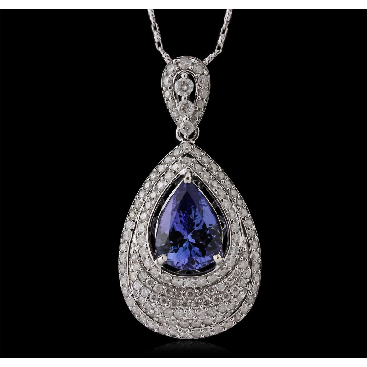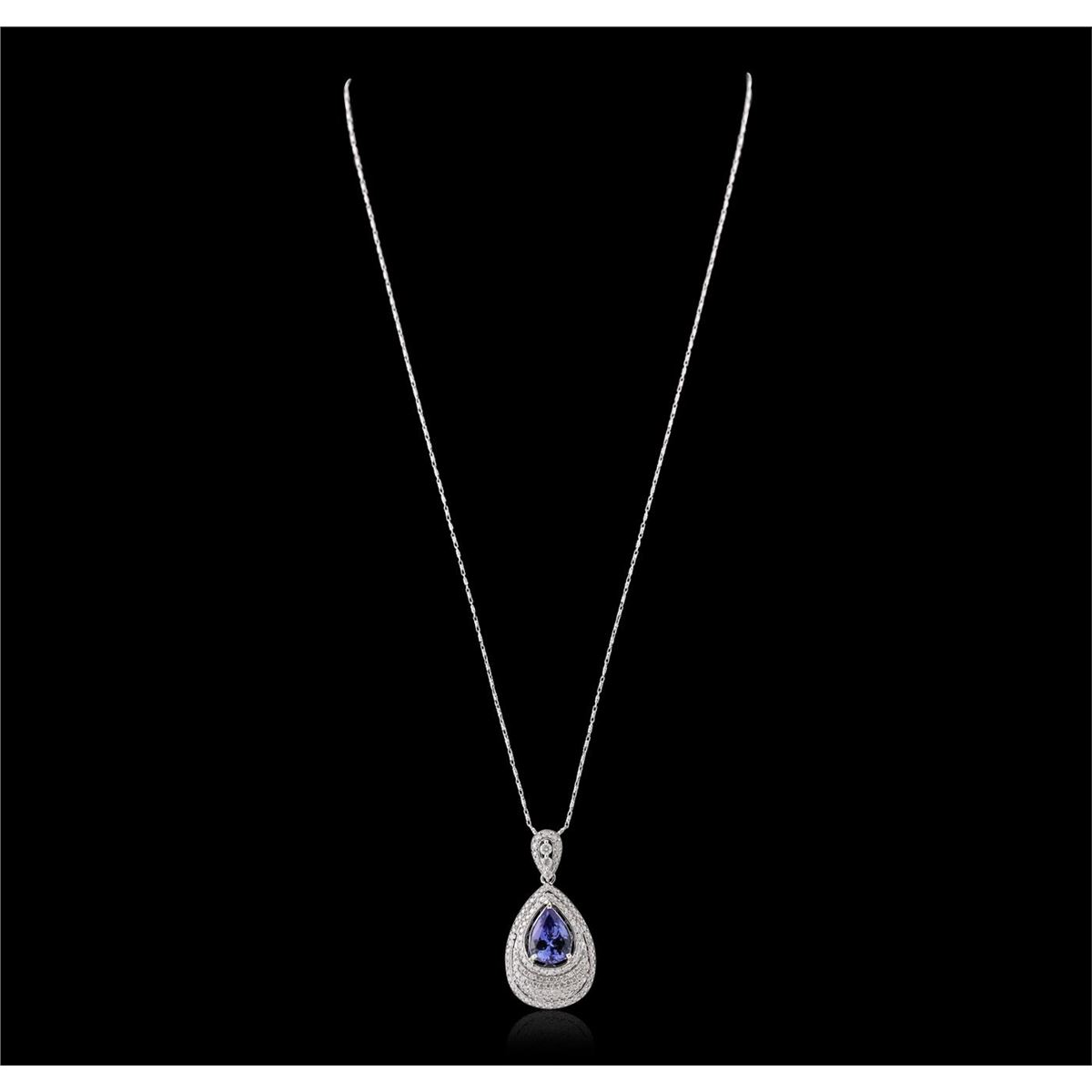 One electronically tested 14KT white gold ladies cast & assembled tanzanite and diamond pendant with chain. The pendant features a tanzanite set within a diamond gallery, completed by a diamond set bail. The pendant is supported by an eighteen inch length 14KT white gold designer style chain, terminating in a lobster claw clasp. Bright polish finish. Trademark is Orianne. Identified with markings of "14K". Condition is new, good workmanship. Containing: One prong set pear brilliant cut natural tanzanite, measuring 11.00 x 7.50 x 5.30mm, 6% bulge factor, approximate weight of 3.11ct., clarity is eye clean, type I, medium dark, very slightly grayish, bluish violet color, (GIA bV 6/3), cut is good. Transmitting light with no distortion, transparent. Graded in the setting. Tanzanite is a very rare gemstone that is only found in the country of Tanzania. Originally discovered in 1967. Tiffany & Company, named the stone Tanzanite. It is found in the Usumburu Mountains that border the Umba Valley of northern Tanzania. Tanzanite occurs in gray, brown, violet, blue, reddish-purple, & green. The gem is interesting because of its exceptional pleochroism. Rotated in different directions a tanzanite will exhibit multiple changes of color. Tanzanite has a low tolerance to ultrasonic cleaning, and should not be cleaned using this method. One Hundred Thirty-Four prong set round brilliant cut diamonds, measuring 1.40 - 1.30 x 0.81mm (depth est.) approximate total weight of 134 Stones = 1.30ct. Graded in the setting. Clarity: I-1 to I-2. Color: H - J Three prong set round brilliant cut diamonds, measuring 2.20 - 1.80 x 1.20mm (depth est.) approximate total weight of 3 Stones = 0.10ct. Graded in the setting. Clarity: I-1 to I-2. Color: G - I. Total Weight of Colored Stones 3.11ct. Total Weight of Diamonds 1.40ct. Total Weight of Pendant With Chain 7.84 grams. AIG Appraised at $12,755.00.