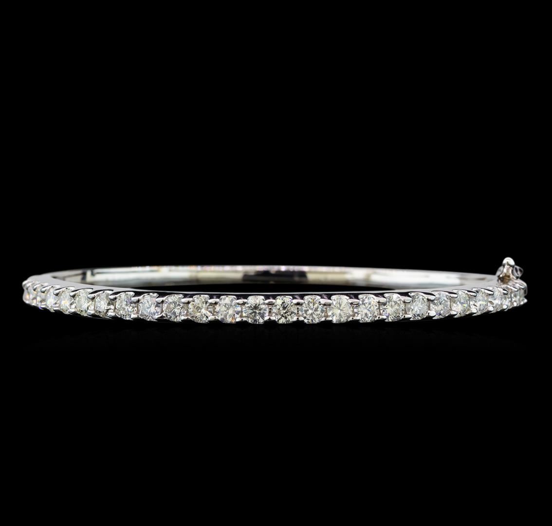 One electronically tested 14KT white gold ladies cast diamond bangle bracelet with a hidden box clasp with safety closer with a bright polish finish. Condition is new. Containing: Twenty-Six prong set round brilliant cut diamonds, measuring 3.20 - 3.20 x 1.92mm (depth est.) approximate total weight of 26 Stones = 3.12ct. Clarity: SI-1 to I-1. Color: H - J, Cut is Good. All diamonds are graded in the mounting, unless otherwise stated. Total Weight of Diamonds 3.12ct. Total Weight of Bangle Bracelet 13.40 grams. GGL Appraised at $8,520.00.