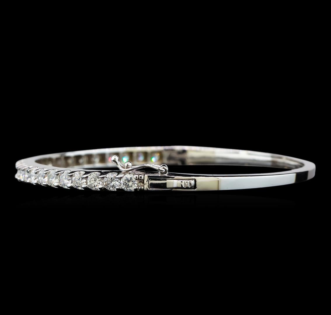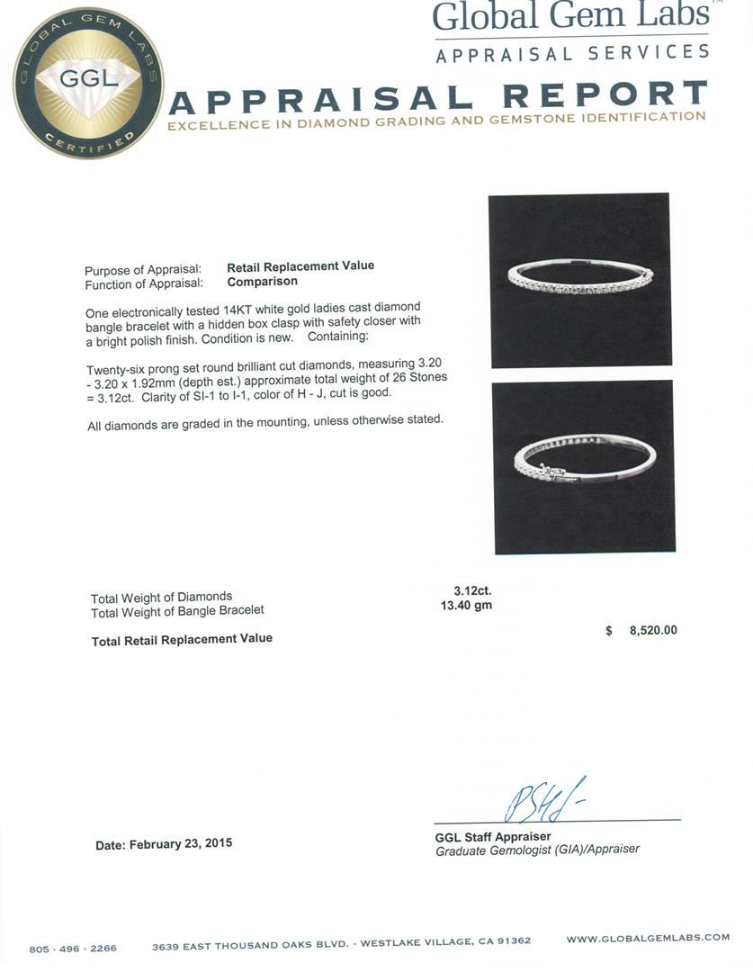 One electronically tested 14KT white gold ladies cast diamond bangle bracelet with a hidden box clasp with safety closer with a bright polish finish. Condition is new. Containing: Twenty-Six prong set round brilliant cut diamonds, measuring 3.20 - 3.20 x 1.92mm (depth est.) approximate total weight of 26 Stones = 3.12ct. Clarity: SI-1 to I-1. Color: H - J, Cut is Good. All diamonds are graded in the mounting, unless otherwise stated. Total Weight of Diamonds 3.12ct. Total Weight of Bangle Bracelet 13.40 grams. GGL Appraised at $8,520.00.