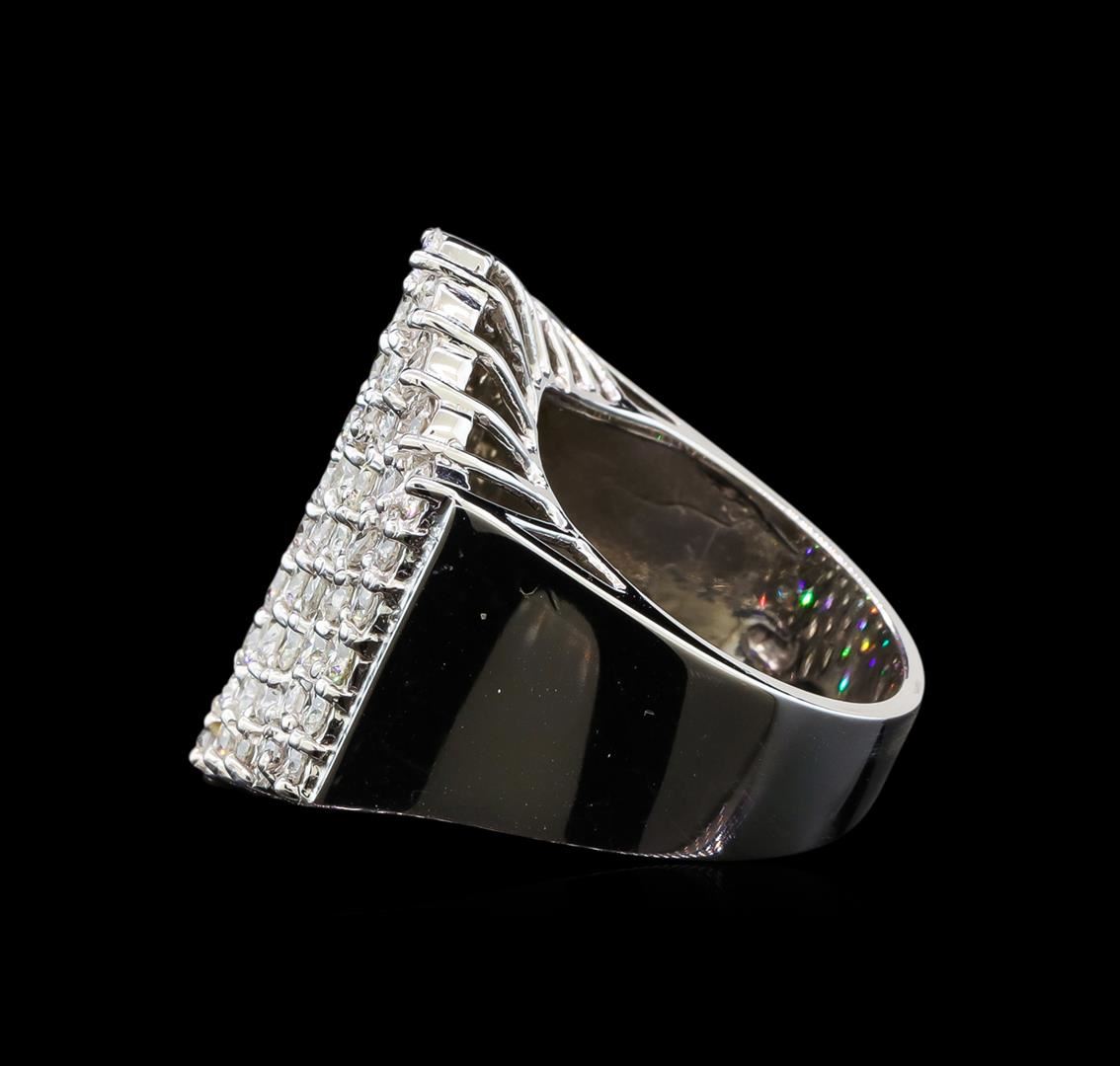 One electronically tested 14KT white gold ladies cast diamond ring with a bright polish finish. Identified with markings of "14K". Condition is new. Containing: Seventy prong set round brilliant cut diamonds, measuring 2.40 - 2.30 x 1.41mm (depth est.) approximate total weight of 70 Stones = 3.12ct. Clarity: VS-2 to SI-1. Color: G - H, Cut is Very Good. All diamonds are graded in the mounting, unless otherwise stated. Total Weight of Diamonds 3.12ct. Total Weight of Ring 14.20 grams. GGL Appraised at $8,155.00.