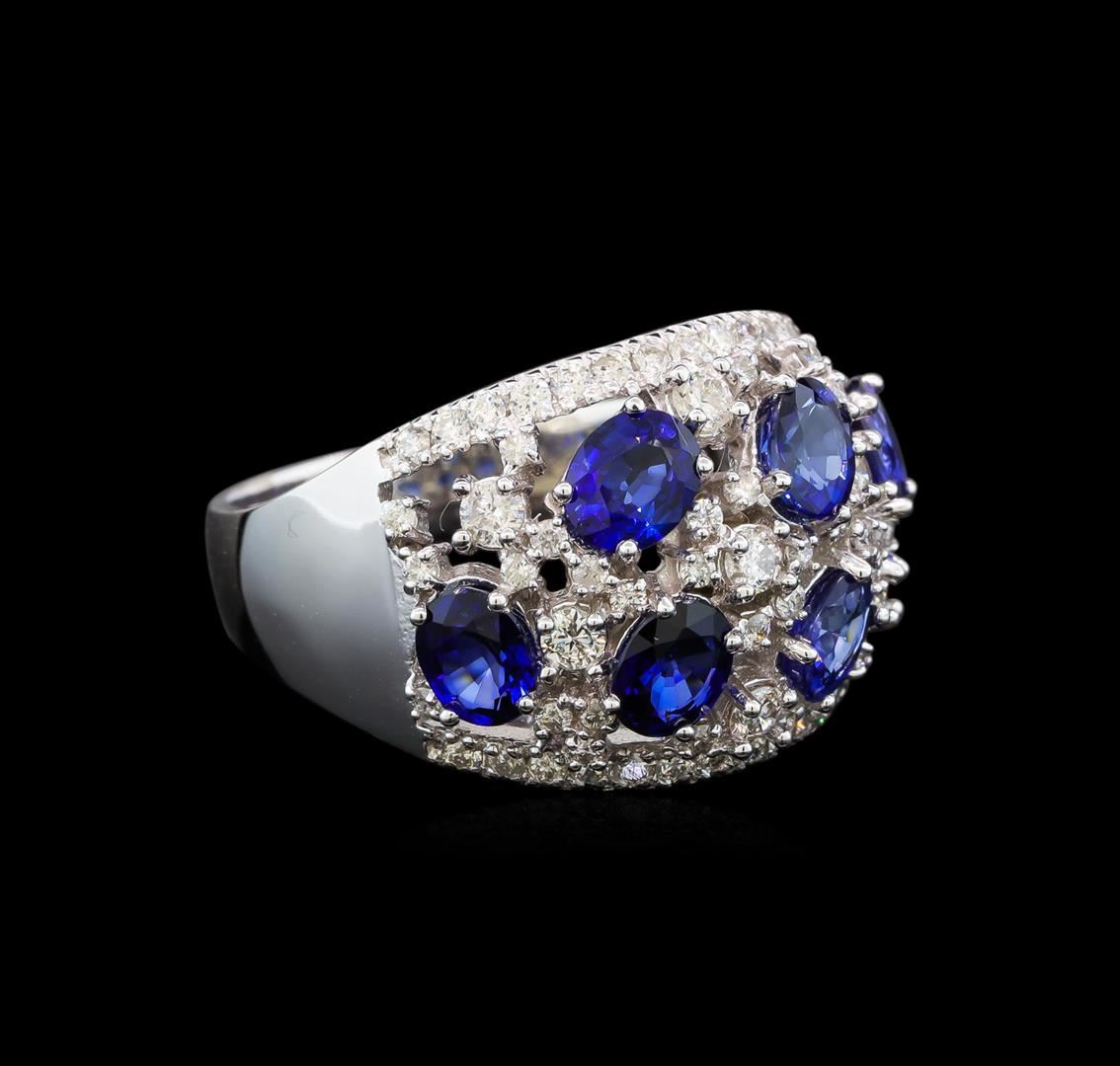 One electronically tested 14KT white gold ladies cast sapphire and diamond ring with a bright polish finish. Identified with markings of "K14". Condition is new. Containing: Six prong set oval modified brilliant cut natural blue sapphires, measuring 6.00 x 4.00 x 2.60mm, approximate total weight of 3.12ct., clarity is slightly included, type II, medium, moderately strong, blue color, (GIA B 5/4), cut is good. Fifty-Nine prong set round brilliant cut diamonds, measuring 1.80 - 1.10 x 0.87mm (depth est.) approximate total weight of 59 Stones = 0.66ct. Clarity: SI-1 to I-1. Color: I - J, Cut is Good. Colored gemstones are presumed to have been subjected to commonly used enhancement processes. All diamonds and colored gemstones are graded in the mounting, unless otherwise stated. Total Weight of Colored Stones 3.12ct. Total Weight of Diamonds 0.66ct. Total Weight of Ring 8.40 grams. GGL Appraised at $5,160.00.