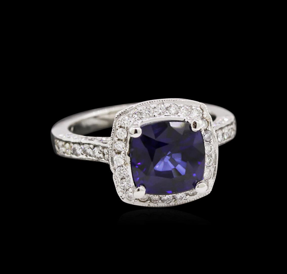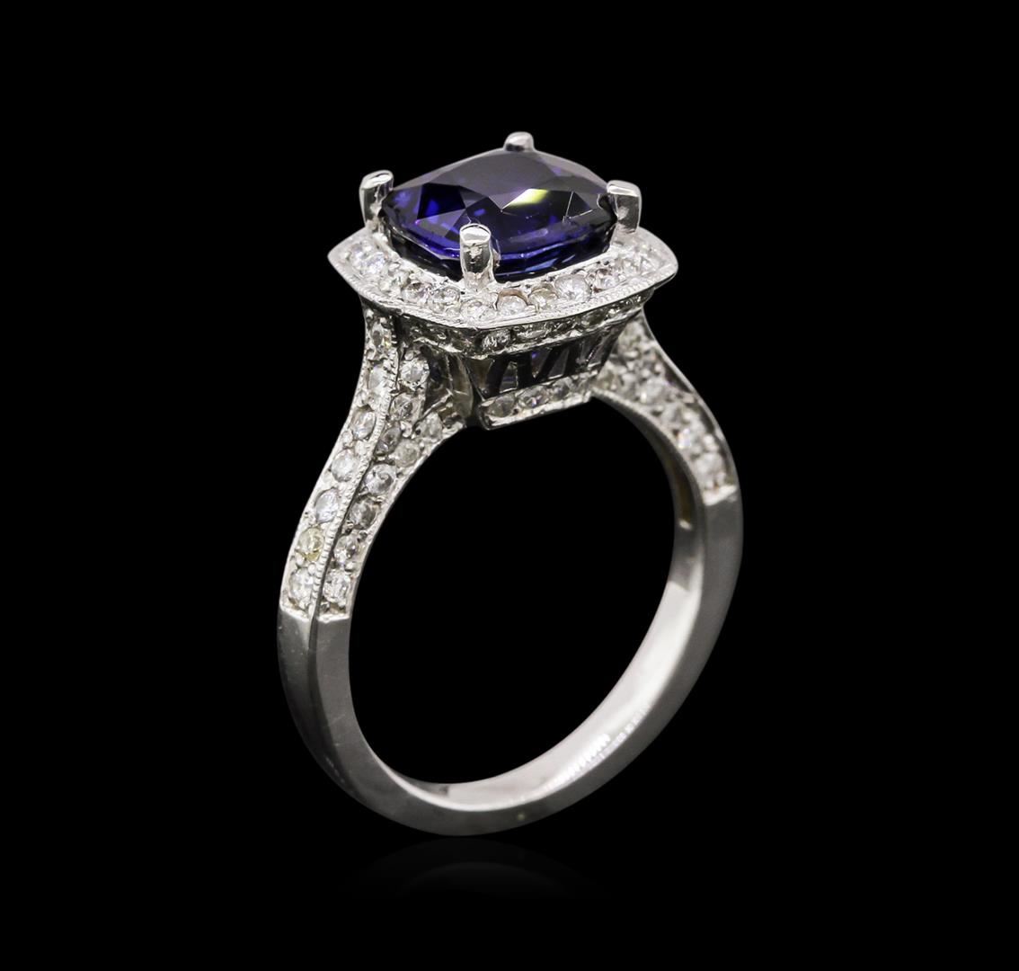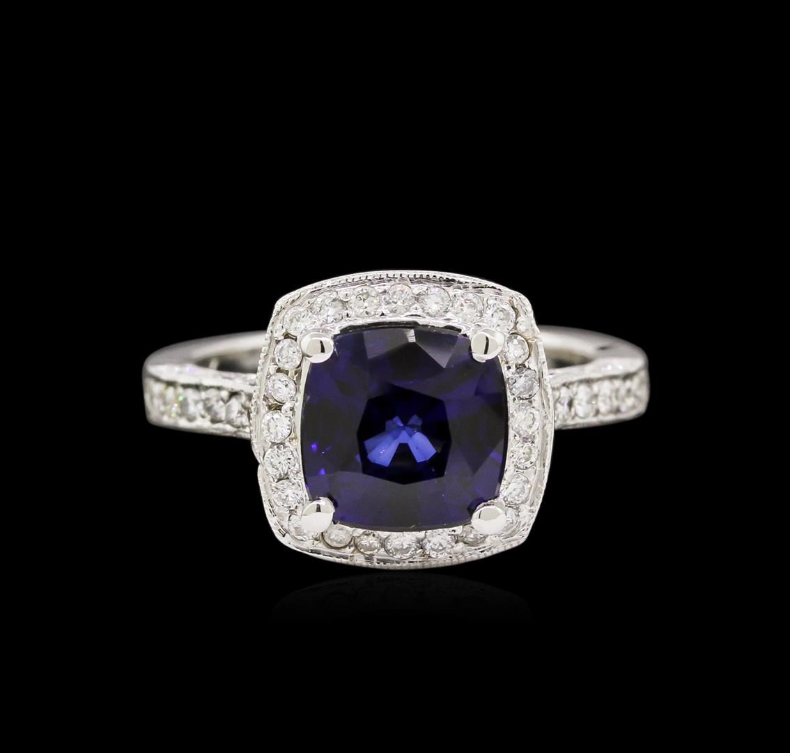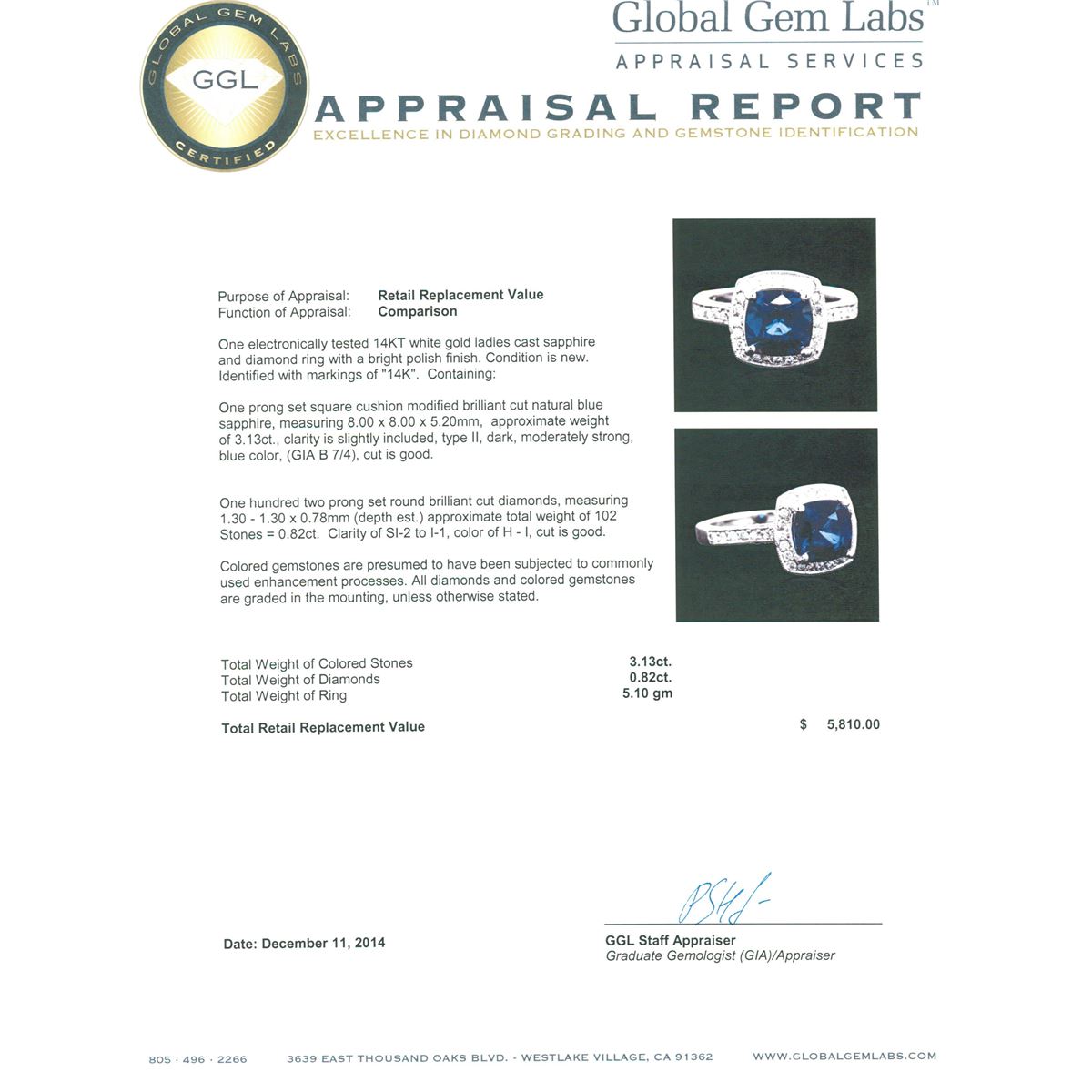 One electronically tested 14KT white gold ladies cast sapphire and diamond ring with a bright polish finish. Identified with markings of "14K". Condition is new. Containing: One prong set square cushion modified brilliant cut natural blue sapphire, measuring 8.00 x 8.00 x 5.20mm, approximate weight of 3.13ct., clarity is slightly included, type II, dark, moderately strong, blue color, (GIA B 7/4), cut is good. One Hundred Two prong set round brilliant cut diamonds, measuring 1.30 - 1.30 x 0.78mm (depth est.) approximate total weight of 102 Stones = 0.82ct. Clarity: SI-2 to I-1. Color: H - I, Cut is Good. Colored gemstones are presumed to have been subjected to commonly used enhancement processes. All diamonds and colored gemstones are graded in the mounting, unless otherwise stated. Total Weight of Colored Stones 3.13ct. Total Weight of Diamonds 0.82ct. Total Weight of Ring 5.10 grams. GGL Appraised at $5,810.00.