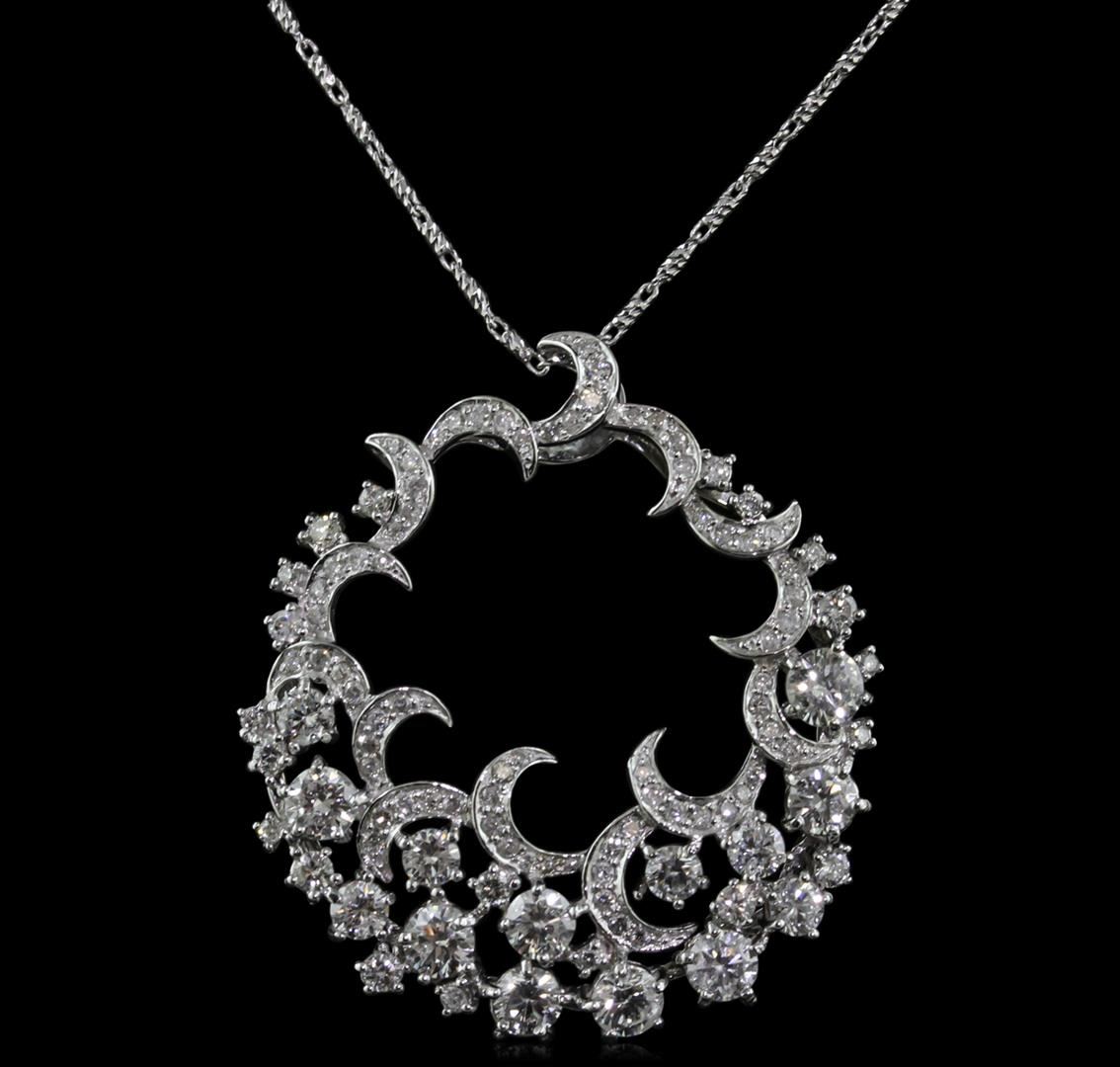 One electronically tested 14KT white gold ladies combination cast & assembled diamond pendant & chain 18.0" long, medium fancy link with a lobster claw clasp with a bright polish finish. Identified with markings of "14K". Condition is new. Containing: Fourteen prong set round brilliant cut diamonds, measuring 3.60 - 3.00 x 1.98mm (depth est.) approximate total weight of 14 Stones = 2.09ct. Clarity: SI-1 to SI-2. Color: I - J, Cut is Good. Eighty-Five prong set round brilliant cut diamonds, measuring 1.90 - 1.10 x 0.90mm (depth est.) approximate total weight of 85 Stones = 1.05ct. Clarity: SI-1 to I-1. Color: I - J, Cut is Good. All diamonds are graded in the mounting, unless otherwise stated. Total Weight of Diamonds 3.14ct. Total Weight of Pendant & Chain 9.80 grams. GGL Appraised at $10,395.00.