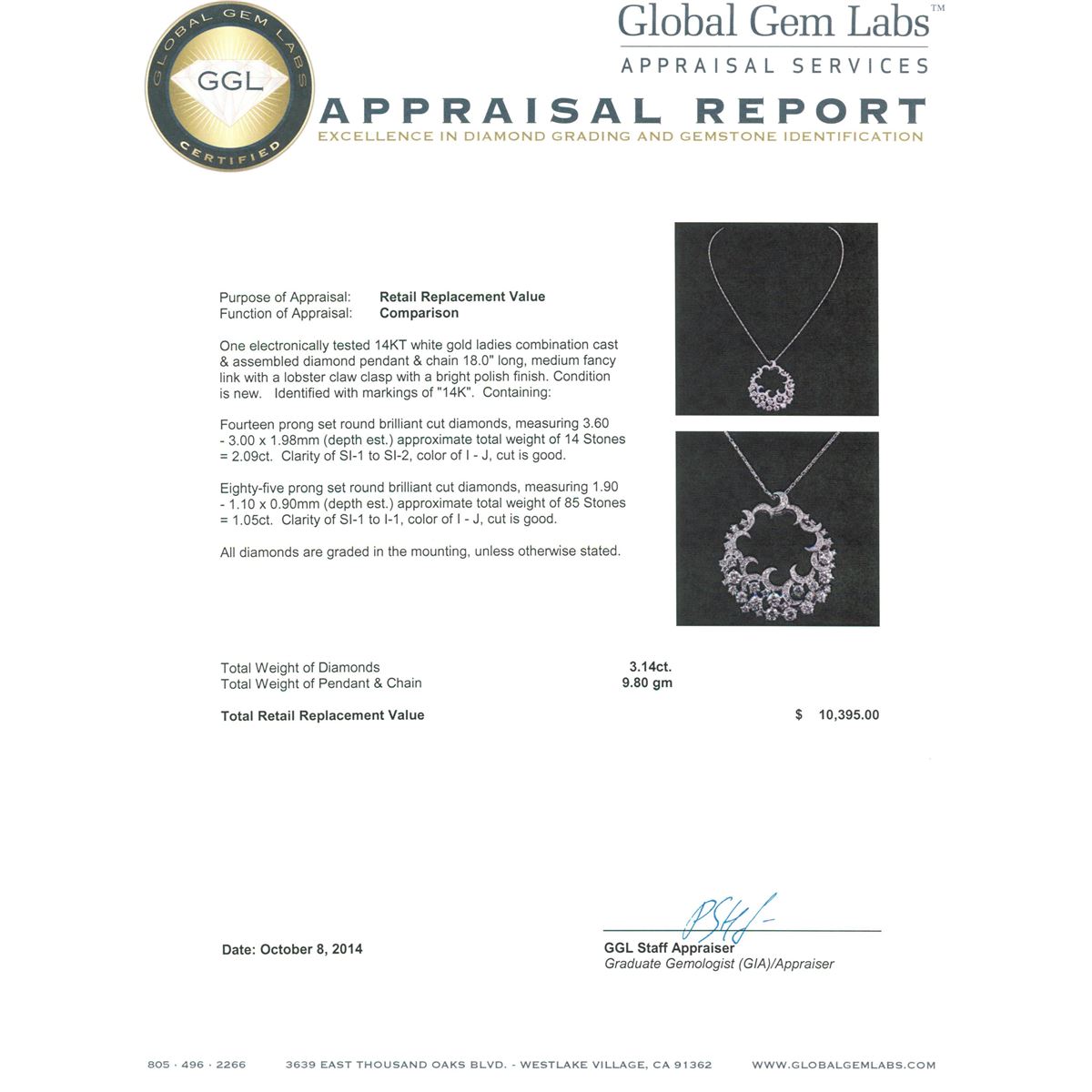 One electronically tested 14KT white gold ladies combination cast & assembled diamond pendant & chain 18.0" long, medium fancy link with a lobster claw clasp with a bright polish finish. Identified with markings of "14K". Condition is new. Containing: Fourteen prong set round brilliant cut diamonds, measuring 3.60 - 3.00 x 1.98mm (depth est.) approximate total weight of 14 Stones = 2.09ct. Clarity: SI-1 to SI-2. Color: I - J, Cut is Good. Eighty-Five prong set round brilliant cut diamonds, measuring 1.90 - 1.10 x 0.90mm (depth est.) approximate total weight of 85 Stones = 1.05ct. Clarity: SI-1 to I-1. Color: I - J, Cut is Good. All diamonds are graded in the mounting, unless otherwise stated. Total Weight of Diamonds 3.14ct. Total Weight of Pendant & Chain 9.80 grams. GGL Appraised at $10,395.00.
