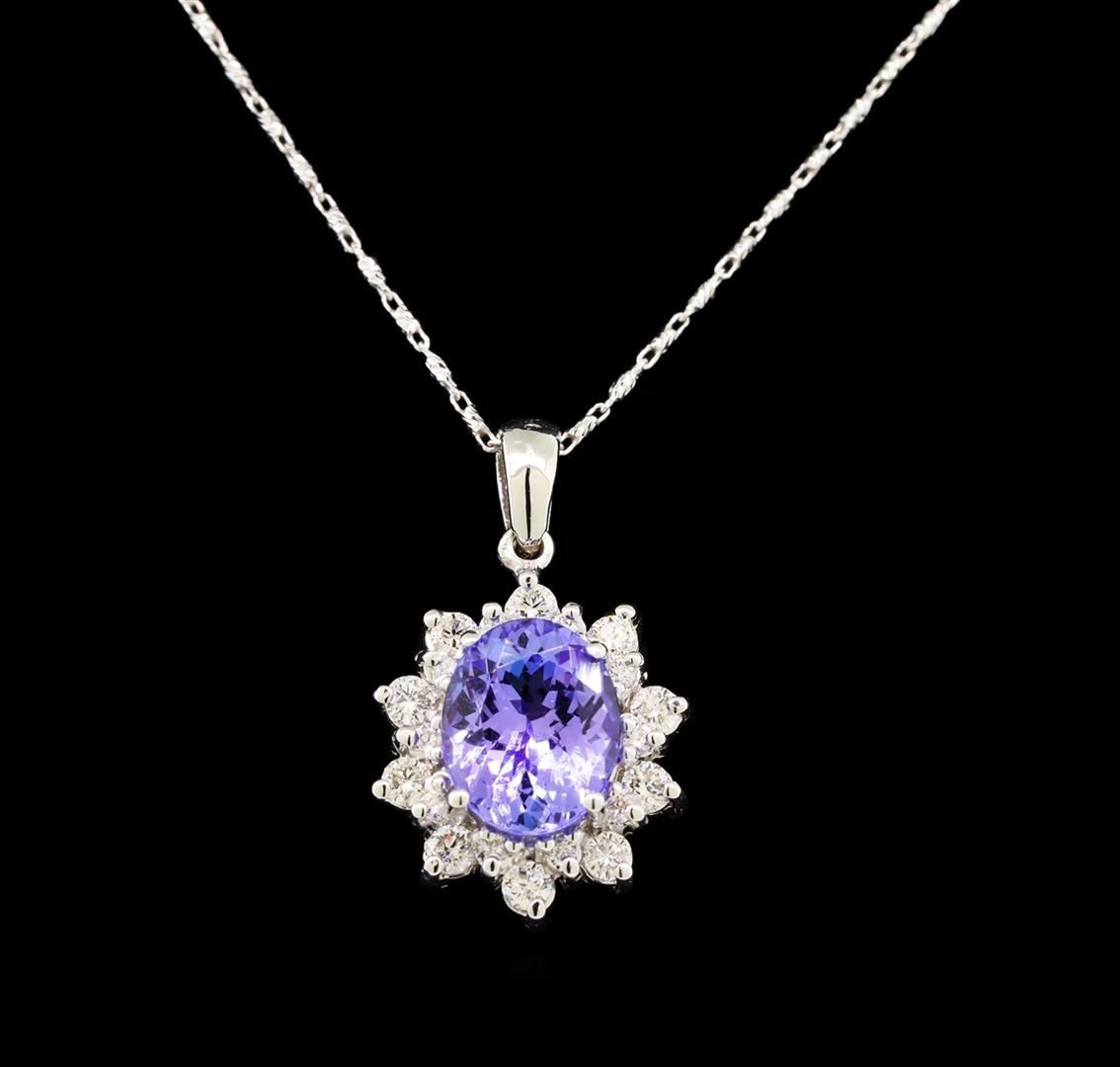 One electronically tested 14KT white gold ladies cast & assembled tanzanite and diamond pendant with chain. The pendant features a tanzanite set within a tiered diamond floret bezel, completed by a white gold bail. The pendant is supported by an eighteen inch length 14KT white gold designer style chain, terminating in a lobster claw clasp. Bright polish finish. Identified with markings of "14K". Condition is new, good workmanship. Containing: One prong set oval mixed cut natural tanzanite, measuring 10.25 x 8.26 x 5.16mm, 6% bulge factor, approximate weight of 3.14ct., clarity is eye clean, type I, medium, very slightly grayish, bluish violet color, (GIA bV 5/3), cut is good. Transmitting light with no distortion, transparent. Graded in the setting. Tanzanite is a very rare gemstone that is only found in the country of Tanzania. Originally discovered in 1967. Tiffany & Company, named the stone Tanzanite. It is found in the Usumburu Mountains that border the Umba Valley of northern Tanzania. Tanzanite occurs in gray, brown, violet, blue, reddish-purple, & green. The gem is interesting because of its exceptional pleochroism. Rotated in different directions a tanzanite will exhibit multiple changes of color. Tanzanite has a low tolerance to ultrasonic cleaning, and should not be cleaned using this method. Ten prong set round brilliant cut diamonds, measuring 2.40 - 2.30 x 1.41mm (depth est.) approximate total weight of 10 Stones = 0.50ct. Graded in the setting. Clarity: VS-1 to SI-1. Color: G - I Ten prong set round brilliant cut diamonds, measuring 1.40 - 1.30 x 0.81mm (depth est.) approximate total weight of 10 Stones = 0.15ct. Graded in the setting. Clarity: VS-1 to SI-1. Color: G - I. Total Weight of Colored Stones 3.14ct. Total Weight of Diamonds 0.65ct. Total Weight of Pendant With Chain 6.68 grams. AIG Appraised at $9,775.00.