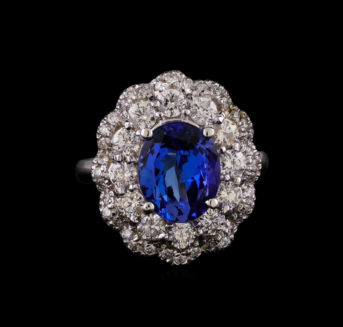 One electronically tested 14KT white gold ladies combination cast & assembled tanzanite and diamond ring with a flat shank with a bright polish finish. Identified with markings of "K14". Condition is new. Containing: One prong set oval modified brilliant cut natural tanzanite, measuring 10.24 x 8.33 x 5.46mm, approximate weight of 3.15ct., clarity is eye clean, type I, medium light, moderately strong, violet color, (GIA V 4/4), cut is good. Twelve prong set round brilliant cut diamonds, measuring 2.50 - 2.50 x 1.50mm (depth est.) approximate total weight of 12 Stones = 0.69ct. Clarity: SI-2 to I-1. Color: I - J, Cut is Good. Thirty-Six prong set round brilliant cut diamonds, measuring 1.00 - 1.00 x 0.60mm (depth est.) approximate total weight of 36 Stones = 0.13ct. Clarity: I-1. Color: H - I, Cut is Good. Colored gemstones are presumed to have been subjected to commonly used enhancement processes. All diamonds and colored gemstones are graded in the mounting, unless otherwise stated. Total Weight of Colored Stones 3.15ct. Total Weight of Diamonds 0.82ct. Total Weight of Ring 8.10 grams. GGL Appraised.