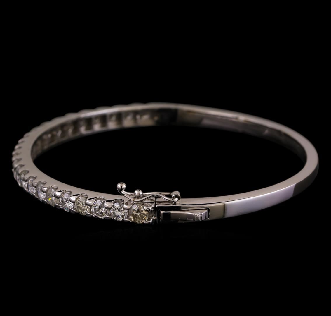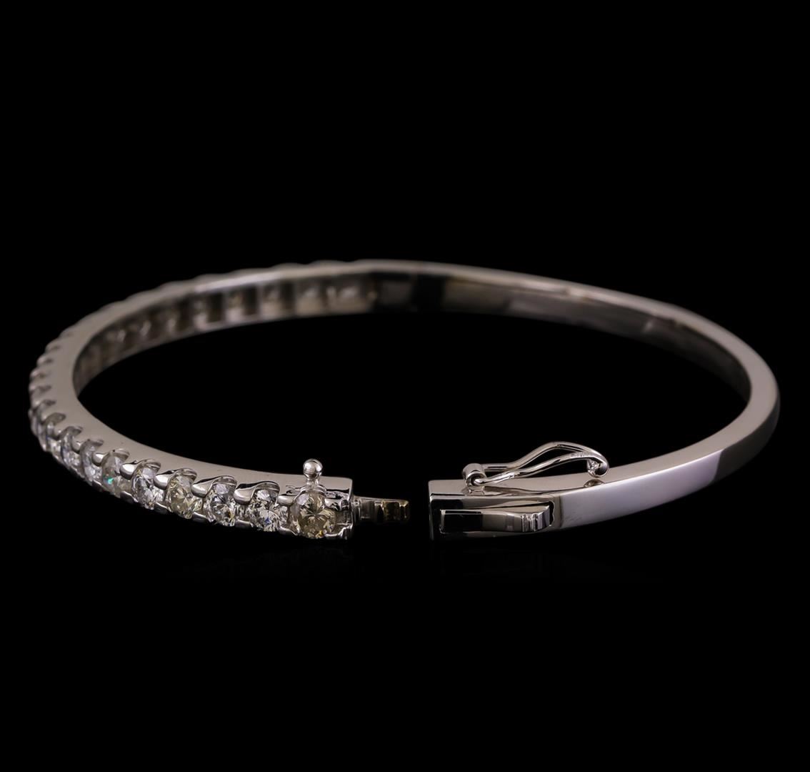 One electronically tested 14KT white gold ladies cast diamond bangle bracelet with a hidden box clasp with safety closer with a bright polish finish. Identified with markings of "K14". Condition is new. Containing: Twenty-Four prong set round brilliant cut diamonds, measuring 3.30 - 3.30 x 1.98mm (depth est.) approximate total weight of 24 Stones = 3.16ct. Clarity: I-1. Color: I - J, Cut is Good. All diamonds are graded in the mounting, unless otherwise stated. Total Weight of Diamonds 3.16ct. Total Weight of Bangle Bracelet 15.00 grams. GGL Appraised at $9,085.00.