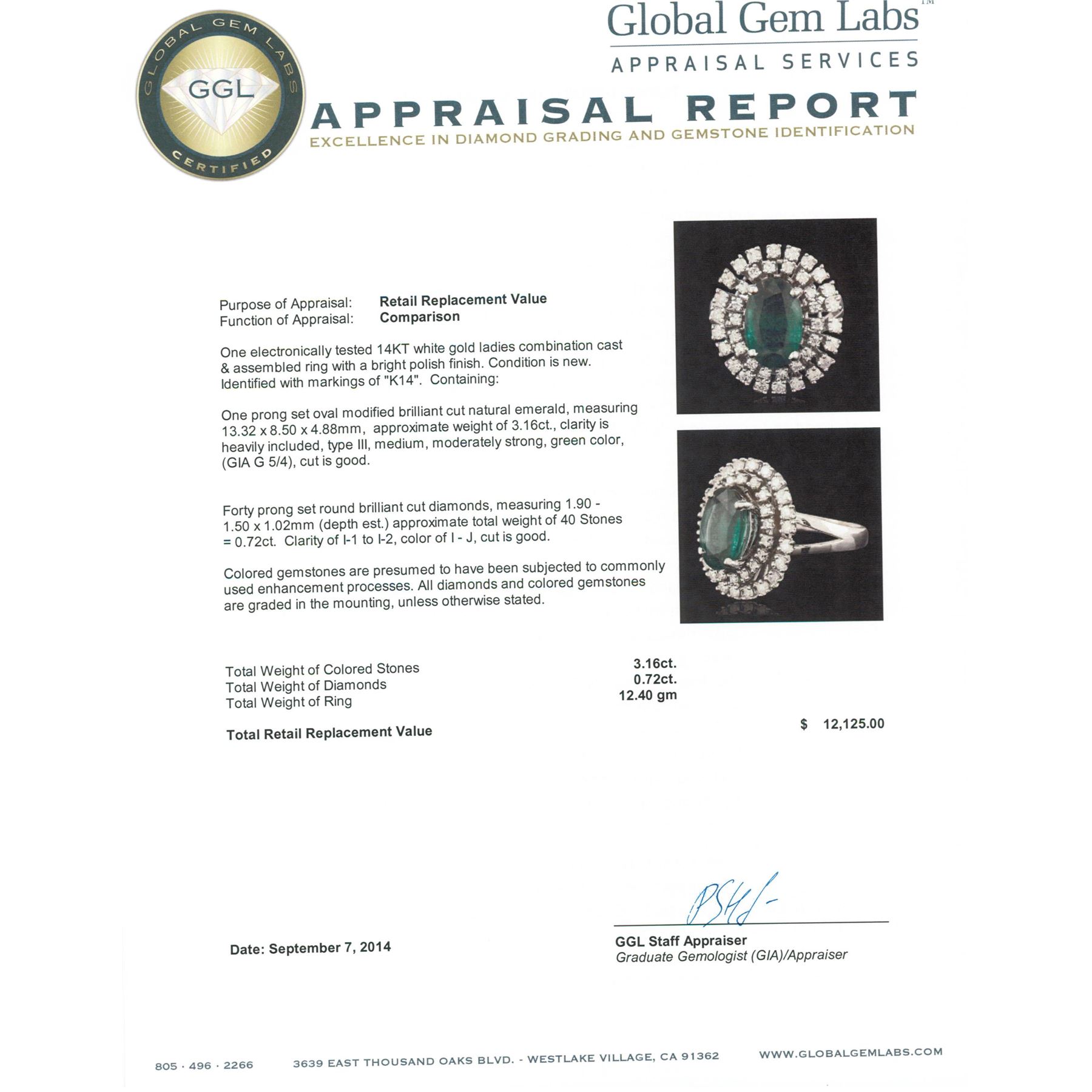 One electronically tested 14KT white gold ladies combination cast & assembled ring with a bright polish finish. Identified with markings of "K14". Condition is new. Containing: One prong set oval modified brilliant cut natural emerald, measuring 13.32 x 8.50 x 4.88mm, approximate weight of 3.16ct., clarity is heavily included, type III, medium, moderately strong, green color, (GIA G 5/4), cut is good. Forty prong set round brilliant cut diamonds, measuring 1.90 - 1.50 x 1.02mm (depth est.) approximate total weight of 40 Stones = 0.72ct. Clarity: I-1 to I-2. Color: I - J, Cut is Good. Colored gemstones are presumed to have been subjected to commonly used enhancement processes. All diamonds and colored gemstones are graded in the mounting, unless otherwise stated. Total Weight of Colored Stones 3.16ct. Total Weight of Diamonds 0.72ct. Total Weight of Ring 12.40 grams. GGL Appraised at $12,125.00.