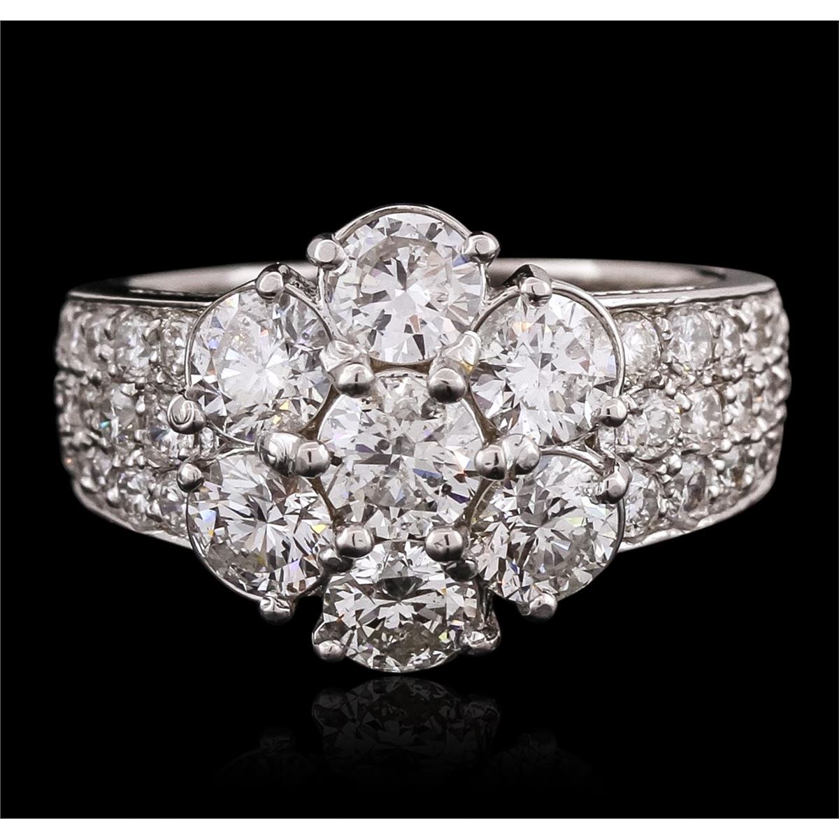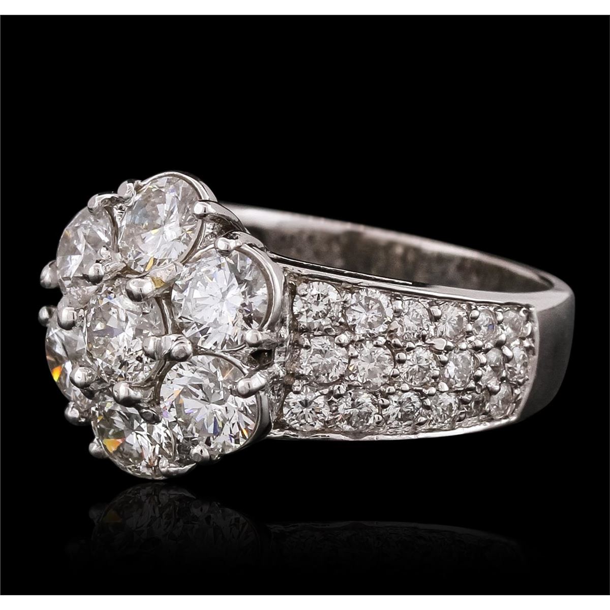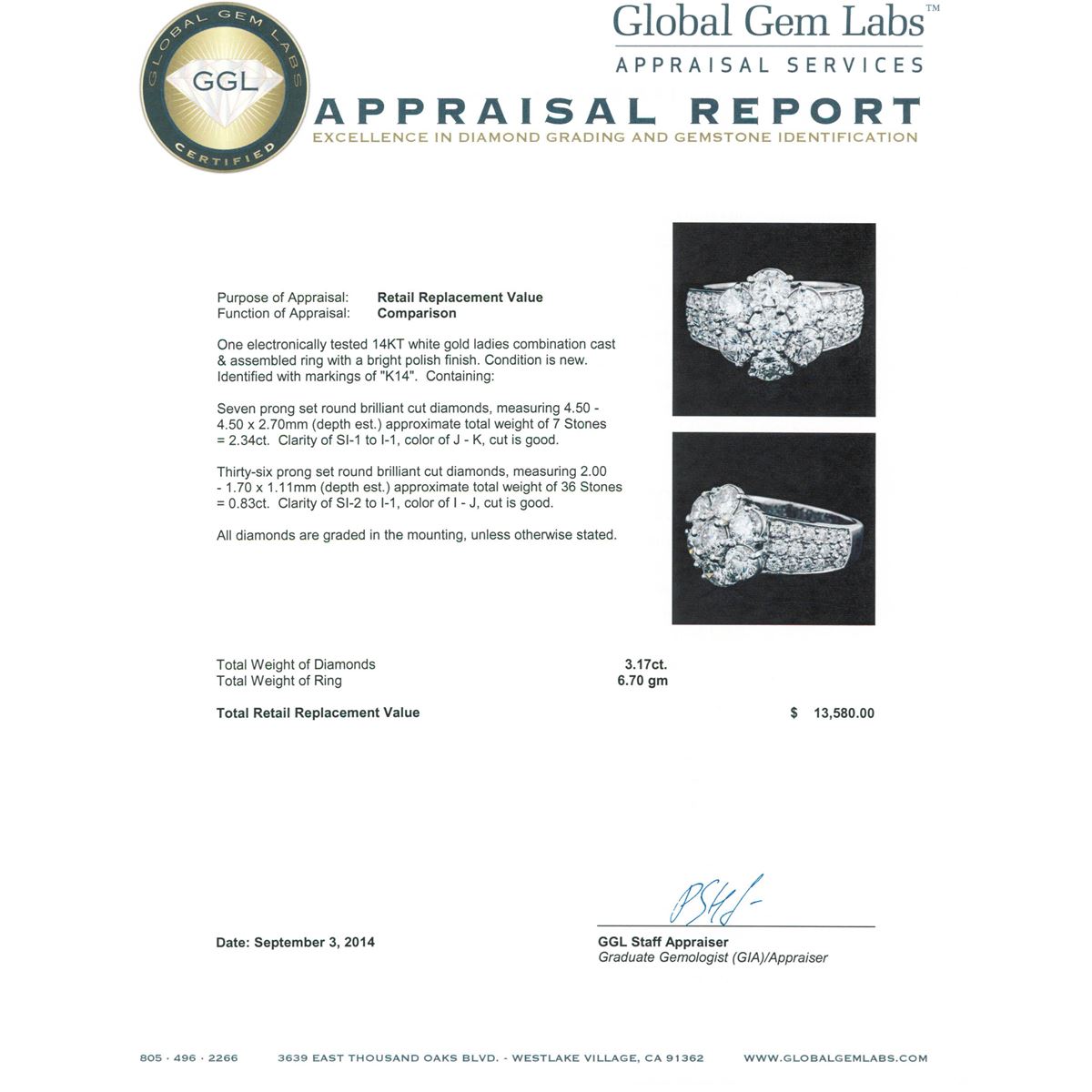 One electronically tested 14KT white gold ladies combination cast & assembled ring with a bright polish finish. Identified with markings of "K14". Condition is new. Containing: Seven prong set round brilliant cut diamonds, measuring 4.50 - 4.50 x 2.70mm (depth est.) approximate total weight of 7 Stones = 2.34ct. Clarity: SI-1 to I-1. Color: J - K, Cut is Good. Thirty-Six prong set round brilliant cut diamonds, measuring 2.00 - 1.70 x 1.11mm (depth est.) approximate total weight of 36 Stones = 0.83ct. Clarity: SI-2 to I-1. Color: I - J, Cut is Good. All diamonds are graded in the mounting, unless otherwise stated. Total Weight of Diamonds 3.17ct. Total Weight of Ring 6.70 grams. GGL Appraised at $13,580.00.
