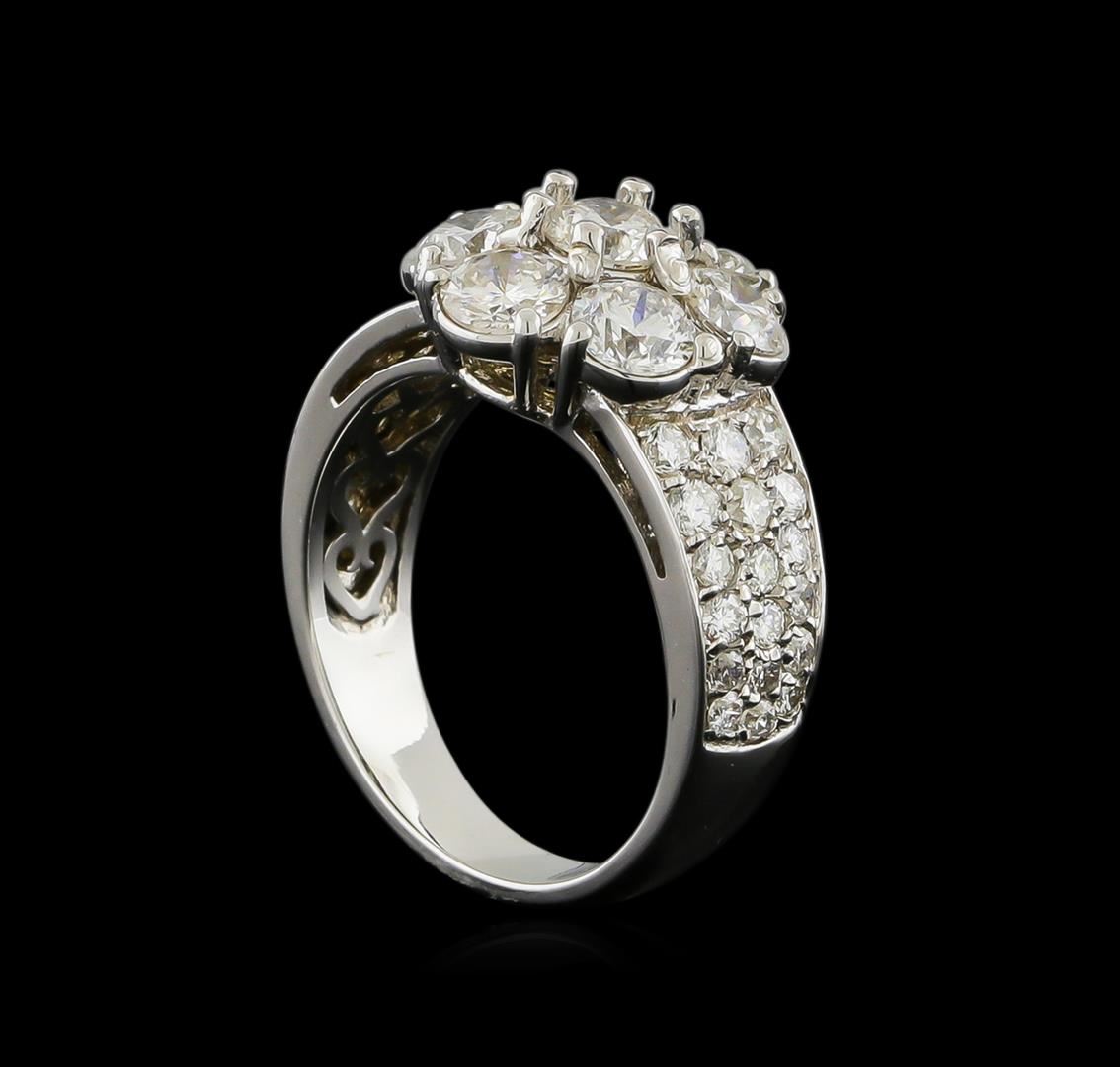 One electronically tested 14KT white gold ladies combination cast & assembled ring with a bright polish finish. Identified with markings of "K14". Condition is new. Containing: Seven prong set round brilliant cut diamonds, measuring 4.50 - 4.50 x 2.70mm (depth est.) approximate total weight of 7 Stones = 2.34ct. Clarity: SI-1 to I-1. Color: J - K, Cut is Good. Thirty-Six prong set round brilliant cut diamonds, measuring 2.00 - 1.70 x 1.11mm (depth est.) approximate total weight of 36 Stones = 0.83ct. Clarity: SI-2 to I-1. Color: I - J, Cut is Good. All diamonds are graded in the mounting, unless otherwise stated. Total Weight of Diamonds 3.17ct. Total Weight of Ring 6.70 grams. GGL Appraised at $13,580.00.