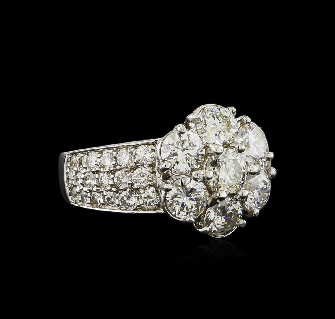 One electronically tested 14KT white gold ladies combination cast & assembled ring with a bright polish finish. Identified with markings of "K14". Condition is new. Containing: Seven prong set round brilliant cut diamonds, measuring 4.50 - 4.50 x 2.70mm (depth est.) approximate total weight of 7 Stones = 2.34ct. Clarity: SI-1 to I-1. Color: J - K, Cut is Good. Thirty-Six prong set round brilliant cut diamonds, measuring 2.00 - 1.70 x 1.11mm (depth est.) approximate total weight of 36 Stones = 0.83ct. Clarity: SI-2 to I-1. Color: I - J, Cut is Good. All diamonds are graded in the mounting, unless otherwise stated. Total Weight of Diamonds 3.17ct. Total Weight of Ring 6.70 grams. GGL Appraised at $13,580.00.
