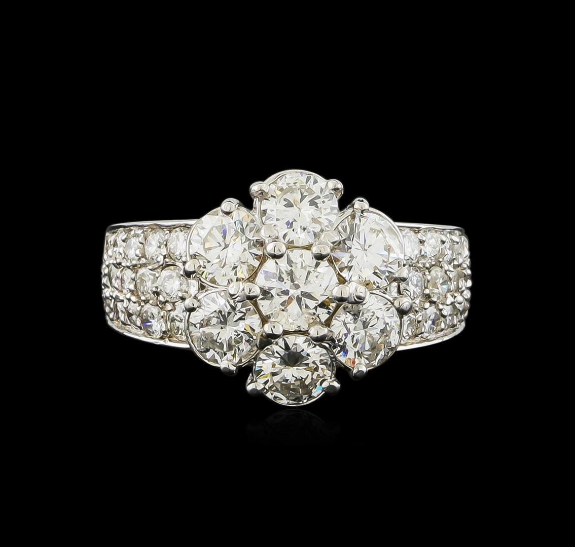 One electronically tested 14KT white gold ladies combination cast & assembled ring with a bright polish finish. Identified with markings of "K14". Condition is new. Containing: Seven prong set round brilliant cut diamonds, measuring 4.50 - 4.50 x 2.70mm (depth est.) approximate total weight of 7 Stones = 2.34ct. Clarity: SI-1 to I-1. Color: J - K, Cut is Good. Thirty-Six prong set round brilliant cut diamonds, measuring 2.00 - 1.70 x 1.11mm (depth est.) approximate total weight of 36 Stones = 0.83ct. Clarity: SI-2 to I-1. Color: I - J, Cut is Good. All diamonds are graded in the mounting, unless otherwise stated. Total Weight of Diamonds 3.17ct. Total Weight of Ring 6.70 grams. GGL Appraised.