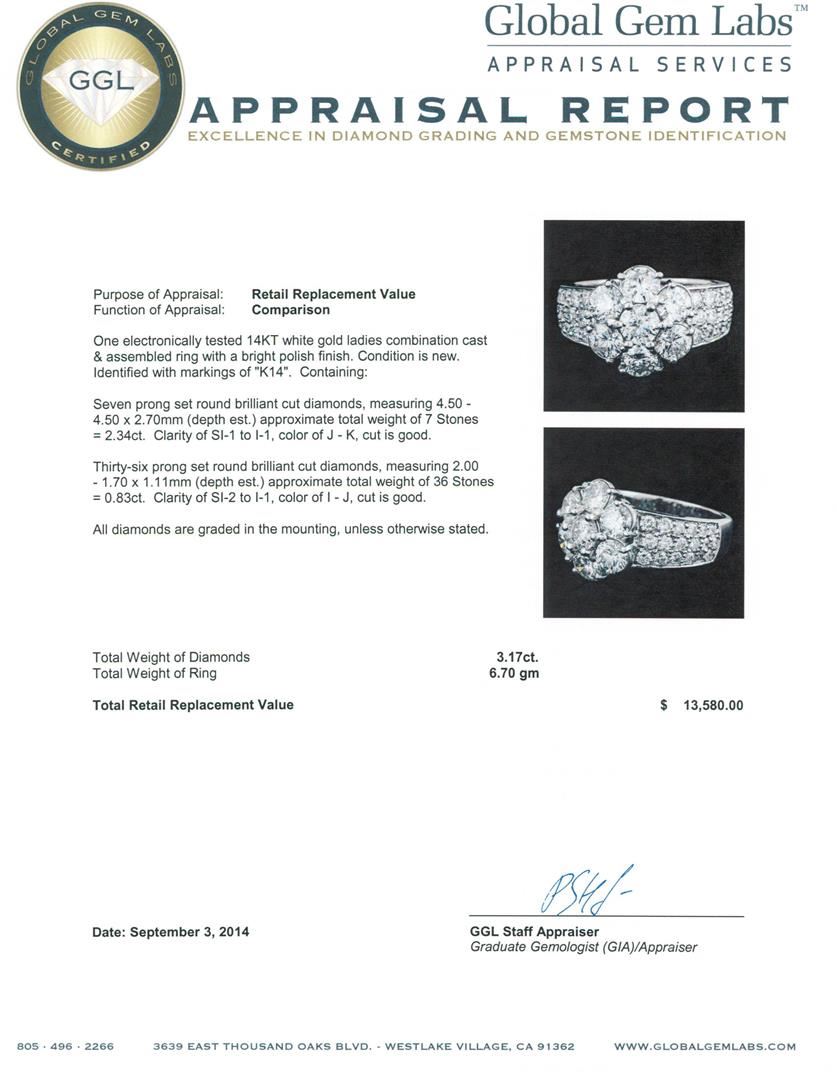 One electronically tested 14KT white gold ladies combination cast & assembled ring with a bright polish finish. Identified with markings of "K14". Condition is new. Containing: Seven prong set round brilliant cut diamonds, measuring 4.50 - 4.50 x 2.70mm (depth est.) approximate total weight of 7 Stones = 2.34ct. Clarity: SI-1 to I-1. Color: J - K, Cut is Good. Thirty-Six prong set round brilliant cut diamonds, measuring 2.00 - 1.70 x 1.11mm (depth est.) approximate total weight of 36 Stones = 0.83ct. Clarity: SI-2 to I-1. Color: I - J, Cut is Good. All diamonds are graded in the mounting, unless otherwise stated. Total Weight of Diamonds 3.17ct. Total Weight of Ring 6.70 grams. GGL Appraised.