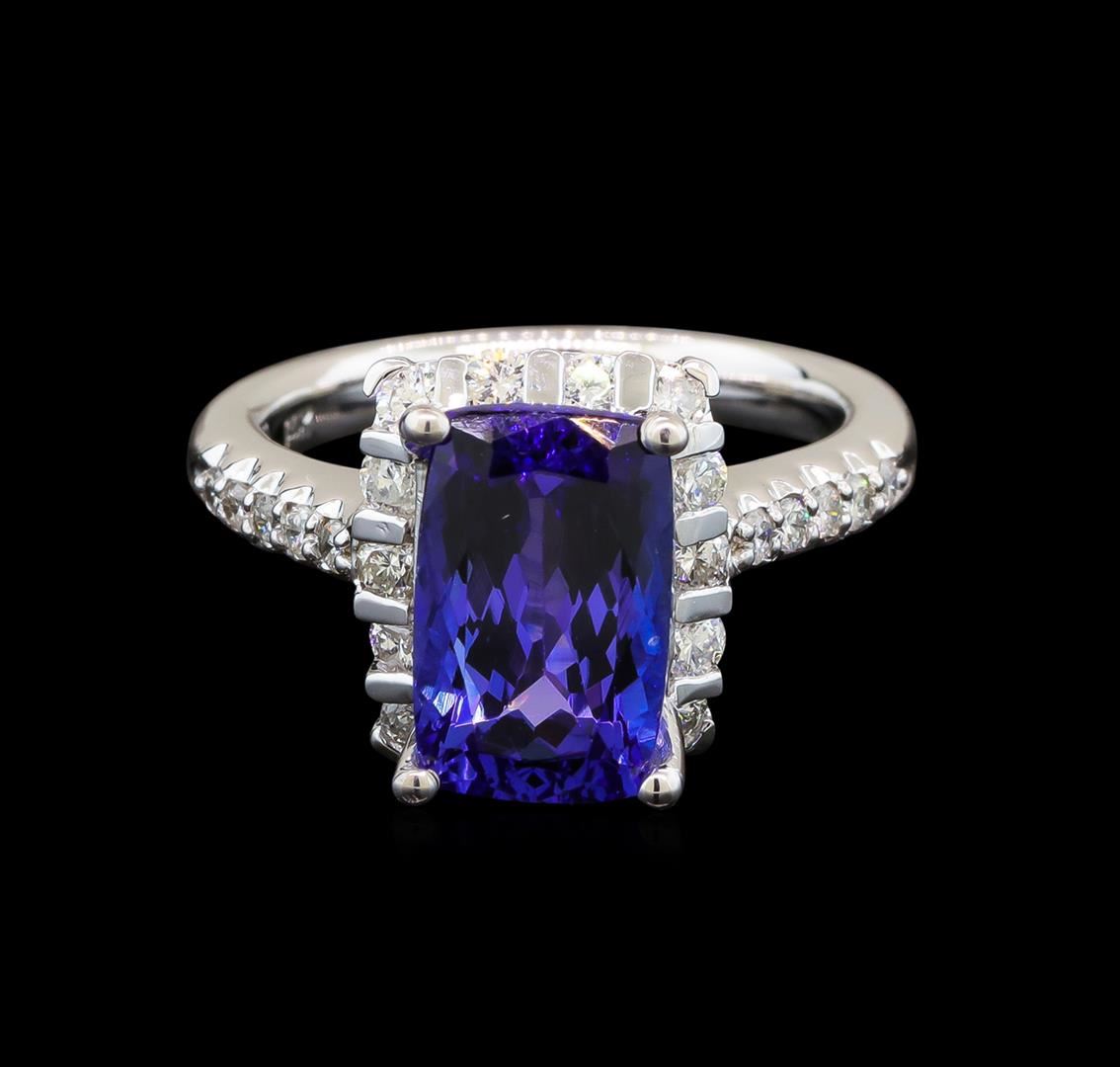 One electronically tested 14KT white gold ladies cast tanzanite and diamond ring with a bright polish finish. Identified with markings of "14K". Condition is new. Containing: One prong set rectangular cushion modified brilliant cut natural tanzanite, measuring 11.60 x 7.30 x 4.75mm, approximate weight of 3.17ct., clarity is eye clean, type I, medium, very slightly grayish, bluish violet color, (GIA bV 5/3), cut is very good. Twenty-Four prong set round brilliant cut diamonds, measuring 2.00 - 1.50 x 1.05mm (depth est.) approximate total weight of 24 Stones = 0.47ct. Clarity: SI-1 to SI-2. Color: I - J, Cut is Good. Colored gemstones are presumed to have been subjected to commonly used enhancement processes. All diamonds and colored gemstones are graded in the mounting, unless otherwise stated. Total Weight of Colored Stones 3.17ct. Total Weight of Diamonds 0.47ct. Total Weight of Ring 6.90 grams. GGL Appraised at $4,220.00.