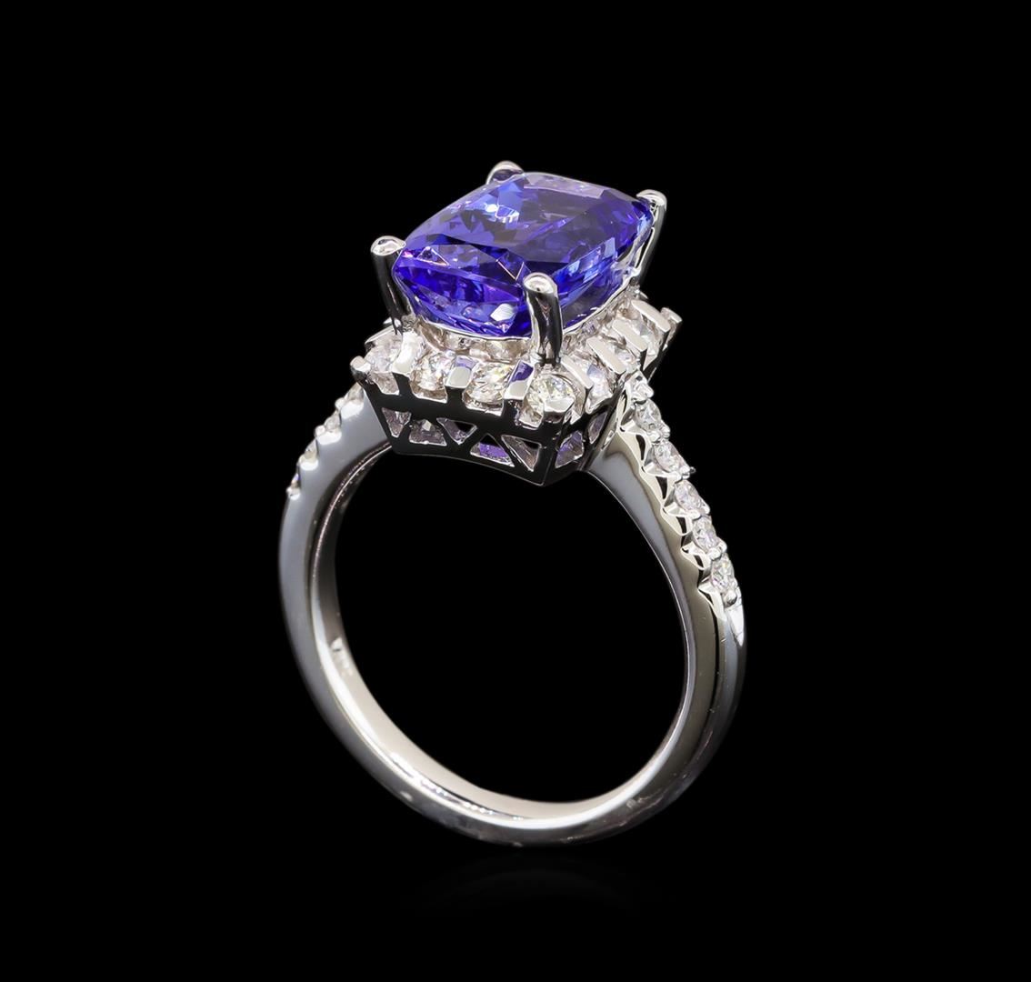 One electronically tested 14KT white gold ladies cast tanzanite and diamond ring with a bright polish finish. Identified with markings of "14K". Condition is new. Containing: One prong set rectangular cushion modified brilliant cut natural tanzanite, measuring 11.60 x 7.30 x 4.75mm, approximate weight of 3.17ct., clarity is eye clean, type I, medium, very slightly grayish, bluish violet color, (GIA bV 5/3), cut is very good. Twenty-Four prong set round brilliant cut diamonds, measuring 2.00 - 1.50 x 1.05mm (depth est.) approximate total weight of 24 Stones = 0.47ct. Clarity: SI-1 to SI-2. Color: I - J, Cut is Good. Colored gemstones are presumed to have been subjected to commonly used enhancement processes. All diamonds and colored gemstones are graded in the mounting, unless otherwise stated. Total Weight of Colored Stones 3.17ct. Total Weight of Diamonds 0.47ct. Total Weight of Ring 6.90 grams. GGL Appraised at $4,220.00.
