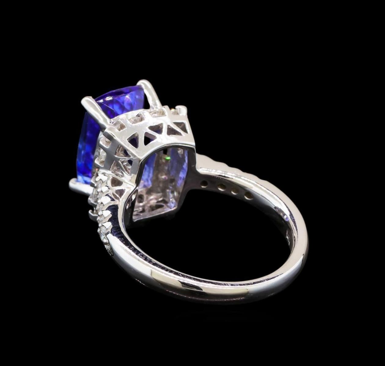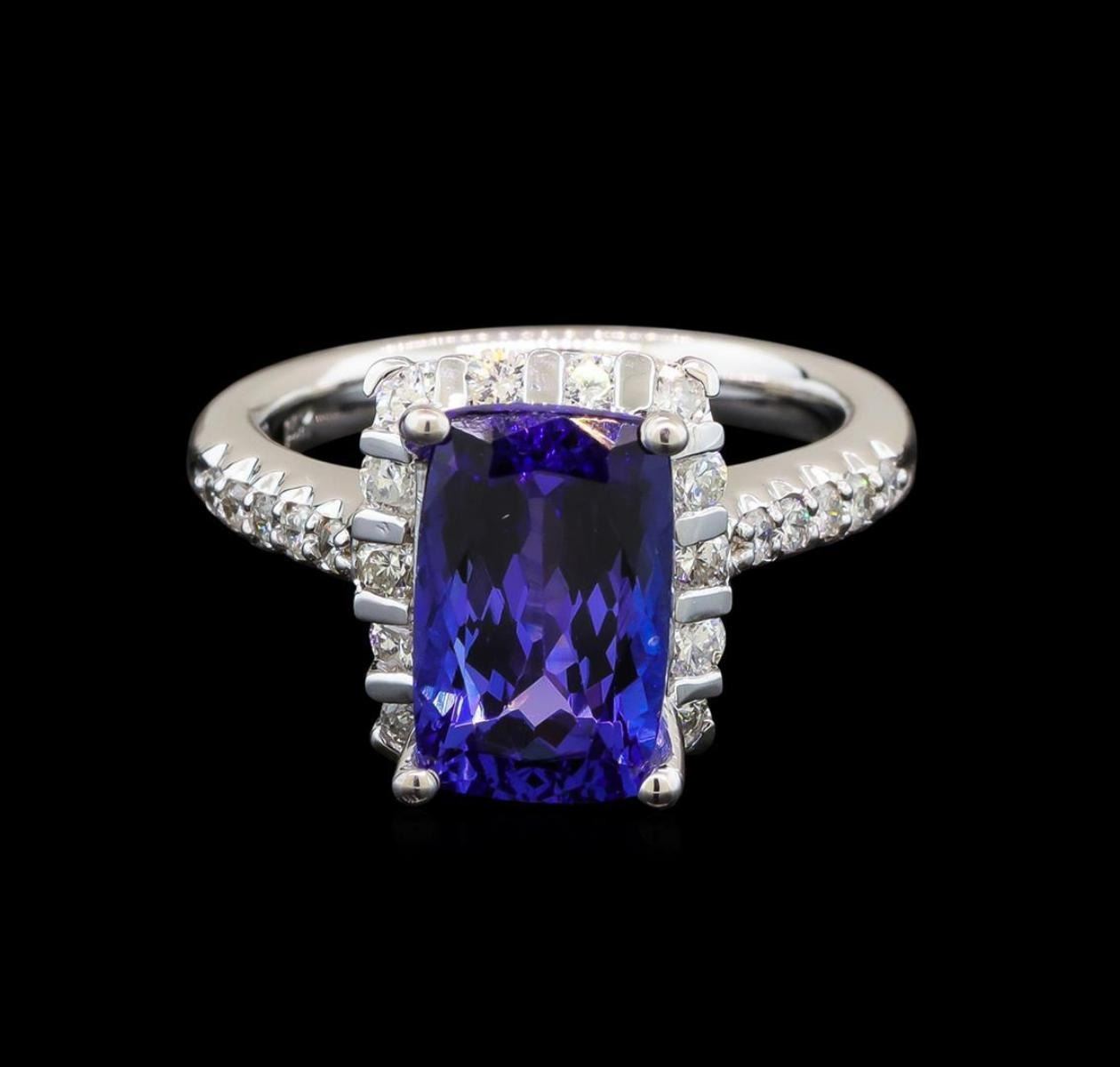 One electronically tested 14KT white gold ladies cast tanzanite and diamond ring with a bright polish finish. Identified with markings of "14K". Condition is new. Containing: One prong set rectangular cushion modified brilliant cut natural tanzanite, measuring 11.60 x 7.30 x 4.75mm, approximate weight of 3.17ct., clarity is eye clean, type I, medium, very slightly grayish, bluish violet color, (GIA bV 5/3), cut is very good. Twenty-Four prong set round brilliant cut diamonds, measuring 2.00 - 1.50 x 1.05mm (depth est.) approximate total weight of 24 Stones = 0.47ct. Clarity: SI-1 to SI-2. Color: I - J, Cut is Good. Colored gemstones are presumed to have been subjected to commonly used enhancement processes. All diamonds and colored gemstones are graded in the mounting, unless otherwise stated. Total Weight of Colored Stones 3.17ct. Total Weight of Diamonds 0.47ct. Total Weight of Ring 6.90 grams. GGL Appraised.