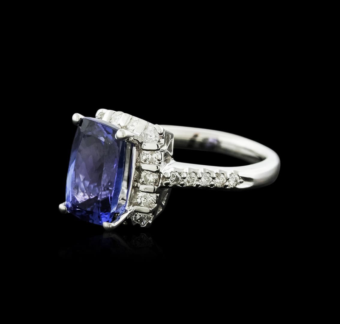 One electronically tested 14KT white gold ladies cast tanzanite and diamond ring with a bright polish finish. Identified with markings of "14K". Condition is new. Containing: One prong set rectangular cushion modified brilliant cut natural tanzanite, measuring 11.60 x 7.30 x 4.75mm, approximate weight of 3.17ct., clarity is eye clean, type I, medium, very slightly grayish, bluish violet color, (GIA bV 5/3), cut is very good. Twenty-Four prong set round brilliant cut diamonds, measuring 2.00 - 1.50 x 1.05mm (depth est.) approximate total weight of 24 Stones = 0.47ct. Clarity: SI-1 to SI-2. Color: I - J, Cut is Good. Colored gemstones are presumed to have been subjected to commonly used enhancement processes. All diamonds and colored gemstones are graded in the mounting, unless otherwise stated. Total Weight of Colored Stones 3.17ct. Total Weight of Diamonds 0.47ct. Total Weight of Ring 6.90 grams. GGL Appraised at $4,220.00.