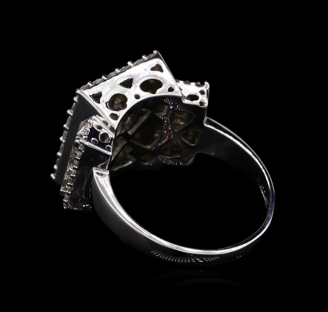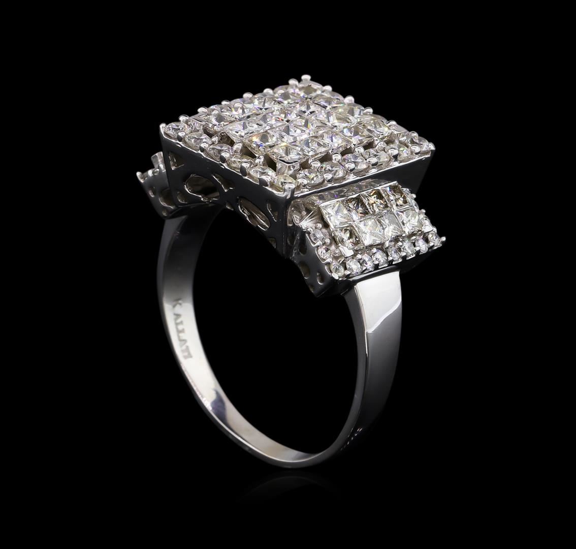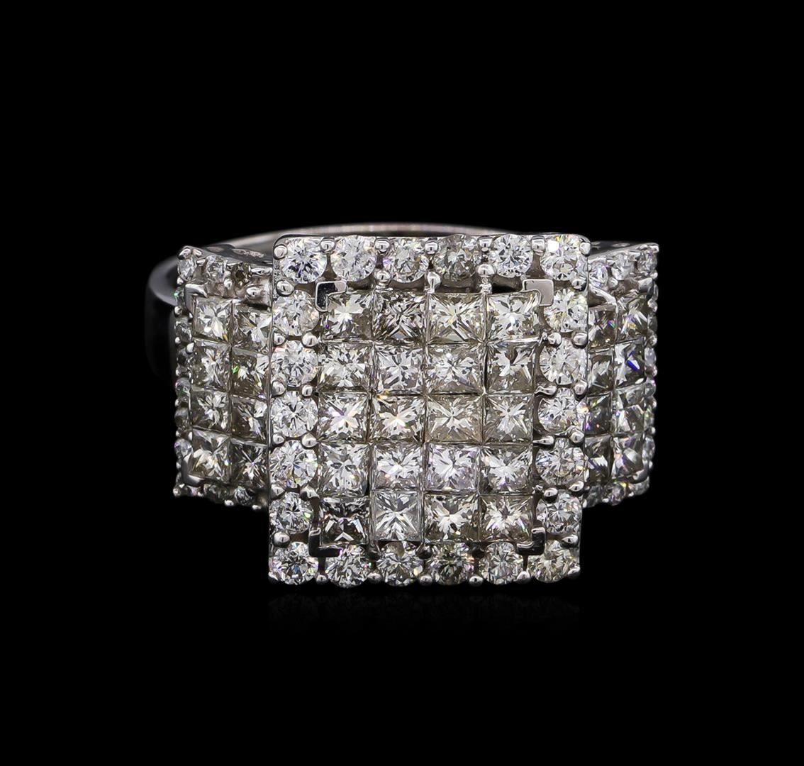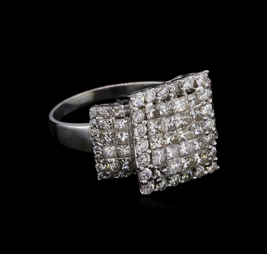 One electronically tested 14KT white gold Ladies combination cast & assembled cluster ring with a bright polish finish. Condition is excellent. Identified with markings of "14K". Containing: Forty-One invisible set princess cut diamonds, measuring 2.40 x 2.00 x 1.50mm (depth est.) approximate total weight of 41 Stones = 2.42ct. Clarity of SI-1 to SI-2, Color of H - J, Cut is Good. Twenty-Four bead set round brilliant cut diamonds, measuring 1.10 - 1.10 x 0.66mm (depth est.) approximate total weight of 24 Stones = 0.12ct. Clarity of I-1 to I-2, Color of G - H, Cut is Very Good. Twenty-Two bead set round brilliant cut diamonds, measuring 2.00 - 2.00 x 1.20mm (depth est.) approximate total weight of 22 Stones = 0.64ct. Clarity of SI-2, Color of H - I, Cut is Good. Total Weight of Diamonds 3.18ct. Total Weight of Ring 7.40gm. GGL Appraised at $9,780.00.
