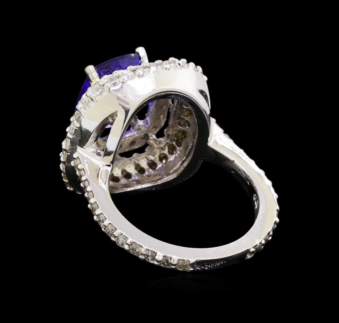 One electronically tested 14KT white gold ladies combination cast & assembled tanzanite and diamond ring with a flat shank with a bright polish finish. Identified with markings of "14K". Condition is new. Containing: One prong set rectangular cushion modified brilliant cut natural tanzanite, measuring 10.40 x 8.16 x 4.76mm, approximate weight of 3.18ct., clarity is eye clean, type I, medium light, very slightly grayish, violet color, (GIA V 4/3), cut is good. One Hundred Three prong set round brilliant cut diamonds, measuring 1.70 - 1.20 x 0.87mm (depth est.) approximate total weight of 103 Stones = 1.14ct. Clarity: I-1 to I-2. Color: I - J, Cut is Good. Colored gemstones are presumed to have been subjected to commonly used enhancement processes. All diamonds and colored gemstones are graded in the mounting, unless otherwise stated. Total Weight of Colored Stones 3.18ct. Total Weight of Diamonds 1.14ct. Total Weight of Ring 9.60 grams. GGL Appraised at $9,565.00.