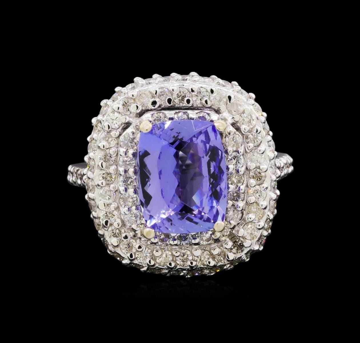 One electronically tested 14KT white gold ladies combination cast & assembled tanzanite and diamond ring with a flat shank with a bright polish finish. Identified with markings of "14K". Condition is new. Containing: One prong set rectangular cushion modified brilliant cut natural tanzanite, measuring 10.40 x 8.16 x 4.76mm, approximate weight of 3.18ct., clarity is eye clean, type I, medium light, very slightly grayish, violet color, (GIA V 4/3), cut is good. One Hundred Three prong set round brilliant cut diamonds, measuring 1.70 - 1.20 x 0.87mm (depth est.) approximate total weight of 103 Stones = 1.14ct. Clarity: I-1 to I-2. Color: I - J, Cut is Good. Colored gemstones are presumed to have been subjected to commonly used enhancement processes. All diamonds and colored gemstones are graded in the mounting, unless otherwise stated. Total Weight of Colored Stones 3.18ct. Total Weight of Diamonds 1.14ct. Total Weight of Ring 9.60 grams. GGL Appraised.