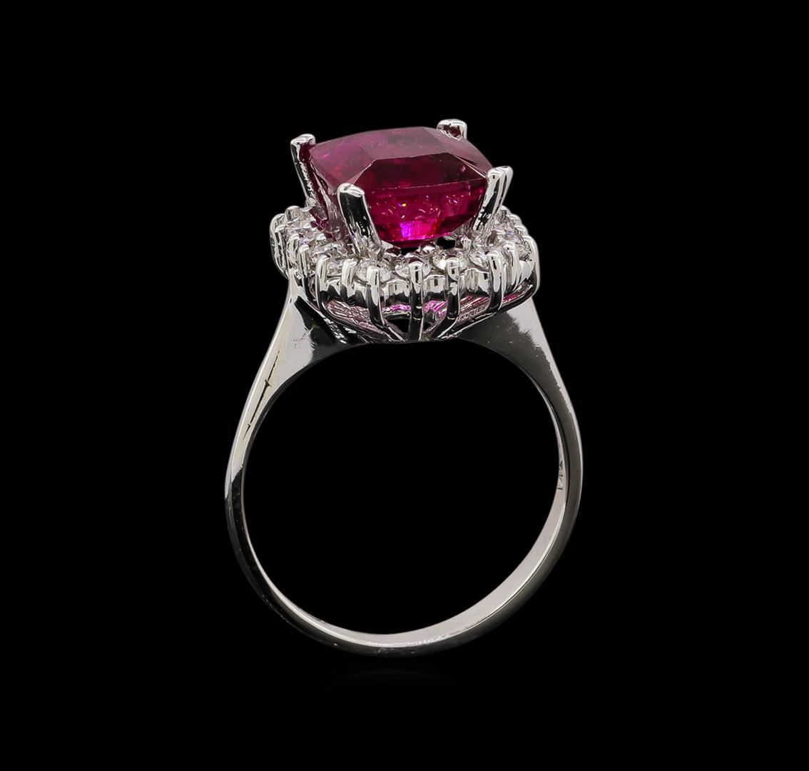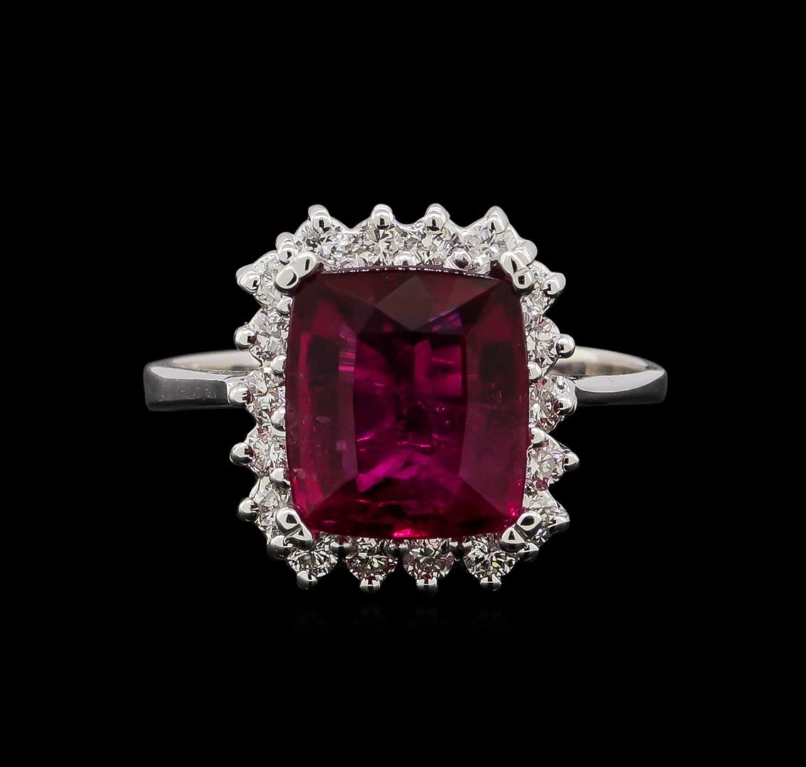 One electronically tested 14KT white gold ladies cast tourmaline and diamond ring with a bright polish finish. Identified with markings of "14KT". Condition is new. Containing: One prong set emerald standard step cut natural pink tourmaline, measuring 9.40 x 8.40 x 4.90mm, approximate weight of 3.20ct., clarity is slightly included, type II, medium light, very slightly grayish, reddish purple color, (GIA rP 4/3), cut is good. Nineteen prong set round brilliant cut diamonds, measuring 1.80 - 1.80 x 1.08mm (depth est.) approximate total weight of 19 Stones = 0.41ct. Clarity: SI-1 to SI-2. Color: I - J, Cut is Good. Colored gemstones are presumed to have been subjected to commonly used enhancement processes. All diamonds and colored gemstones are graded in the mounting, unless otherwise stated. Total Weight of Colored Stones 3.20ct. Total Weight of Diamonds 0.41ct. Total Weight of Ring 3.80 grams. GGL Appraised.