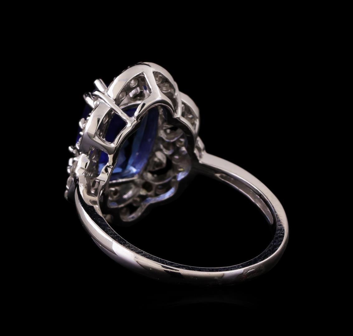 One electronically tested 14KT white gold ladies cast tanzanite and diamond ring with a bright polish finish. Identified with markings of "K14". Condition is new. Containing: One prong set rectangular cushion modified brilliant cut natural tanzanite, measuring 11.10 x 7.50 x 4.88mm, approximate weight of 3.20ct., clarity is eye clean, type I, medium light, very slightly grayish, violet color, (GIA V 4/3), cut is good. Forty prong set round brilliant cut diamonds, measuring 1.30 - 1.30 x 0.78mm (depth est.) approximate total weight of 40 Stones = 0.32ct. Clarity: SI-2 to I-1. Color: H - I, Cut is Good. Colored gemstones are presumed to have been subjected to commonly used enhancement processes. All diamonds and colored gemstones are graded in the mounting, unless otherwise stated. Total Weight of Colored Stones 3.20ct. Total Weight of Diamonds 0.32ct. Total Weight of Ring 5.40 grams. GGL Appraised at $4,475.00.
