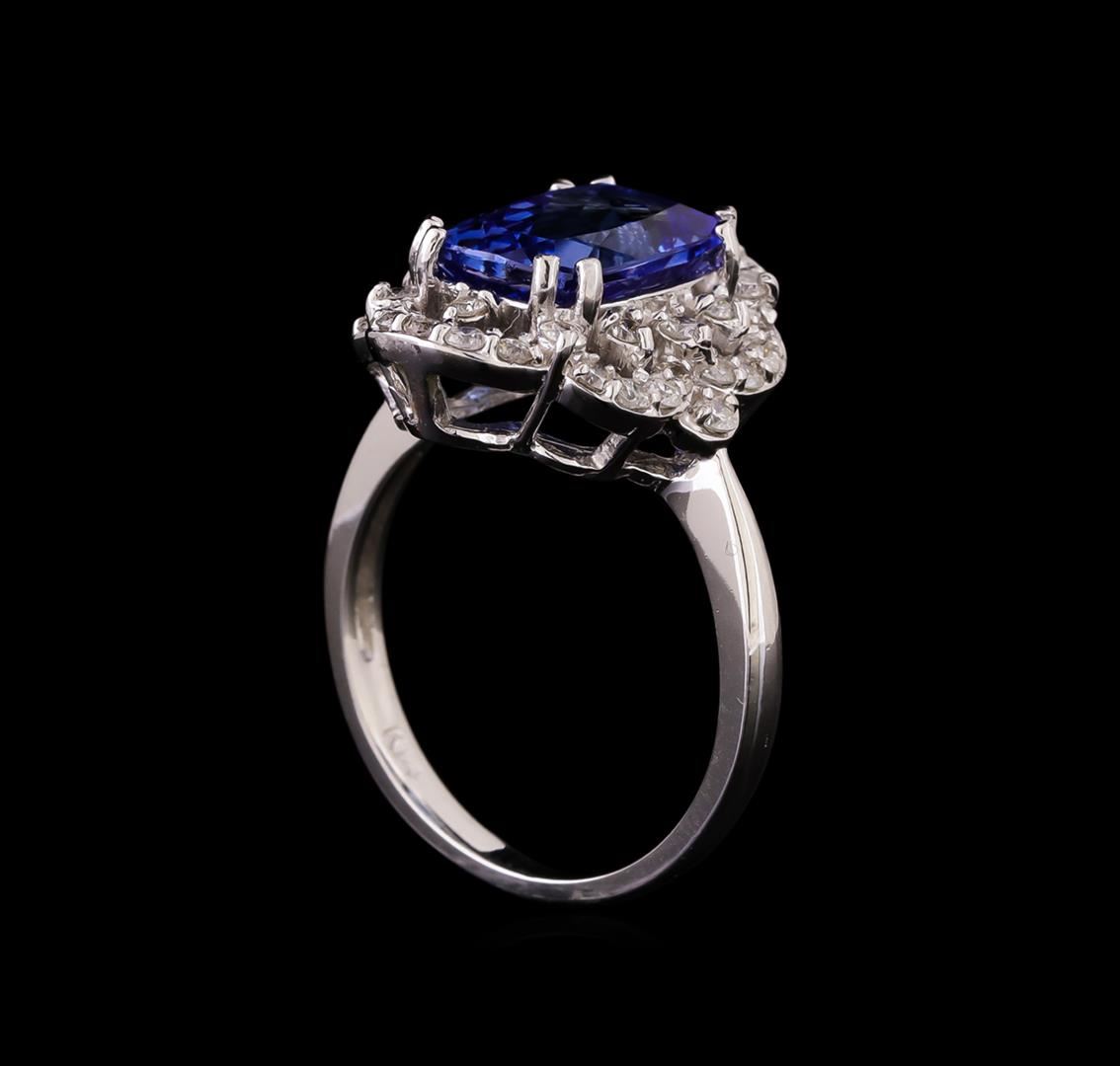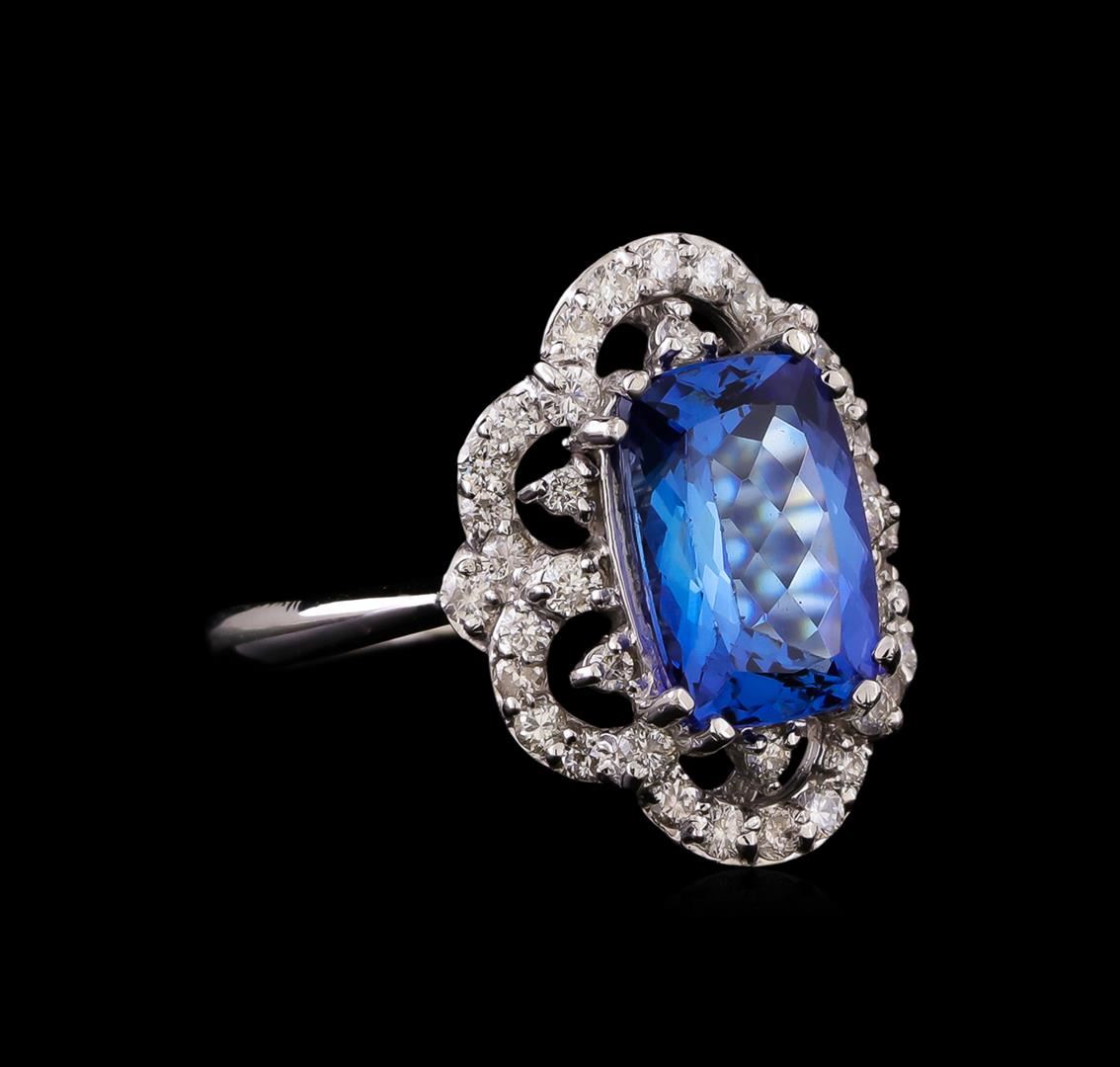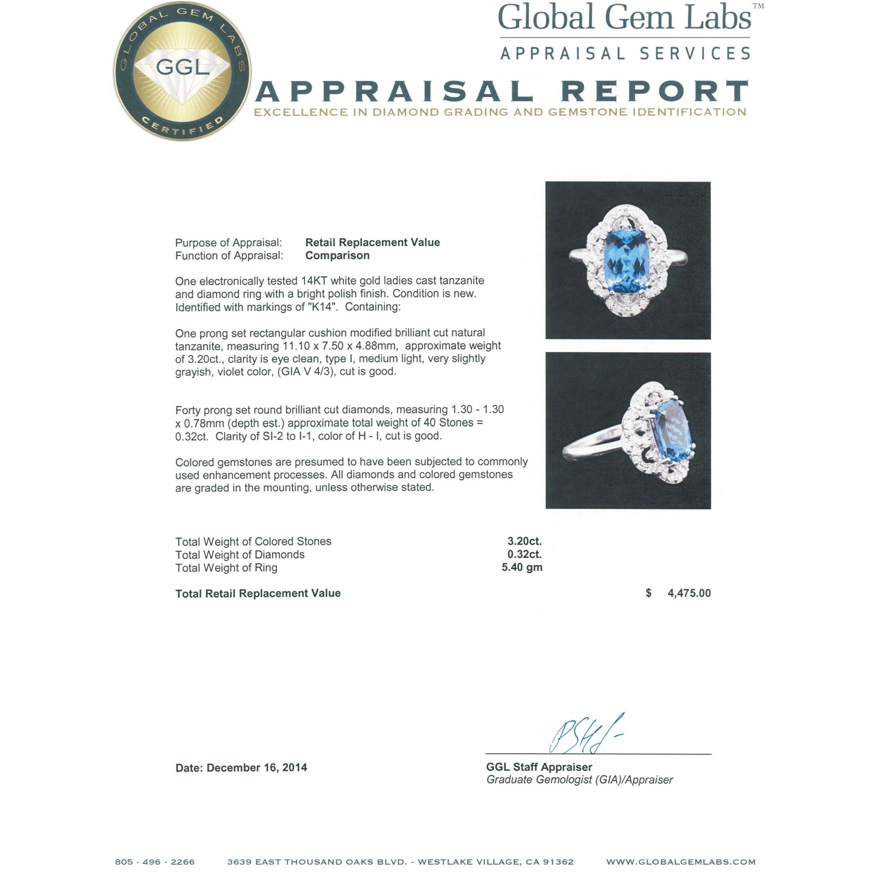 One electronically tested 14KT white gold ladies cast tanzanite and diamond ring with a bright polish finish. Identified with markings of "K14". Condition is new. Containing: One prong set rectangular cushion modified brilliant cut natural tanzanite, measuring 11.10 x 7.50 x 4.88mm, approximate weight of 3.20ct., clarity is eye clean, type I, medium light, very slightly grayish, violet color, (GIA V 4/3), cut is good. Forty prong set round brilliant cut diamonds, measuring 1.30 - 1.30 x 0.78mm (depth est.) approximate total weight of 40 Stones = 0.32ct. Clarity: SI-2 to I-1. Color: H - I, Cut is Good. Colored gemstones are presumed to have been subjected to commonly used enhancement processes. All diamonds and colored gemstones are graded in the mounting, unless otherwise stated. Total Weight of Colored Stones 3.20ct. Total Weight of Diamonds 0.32ct. Total Weight of Ring 5.40 grams. GGL Appraised at $4,475.00.