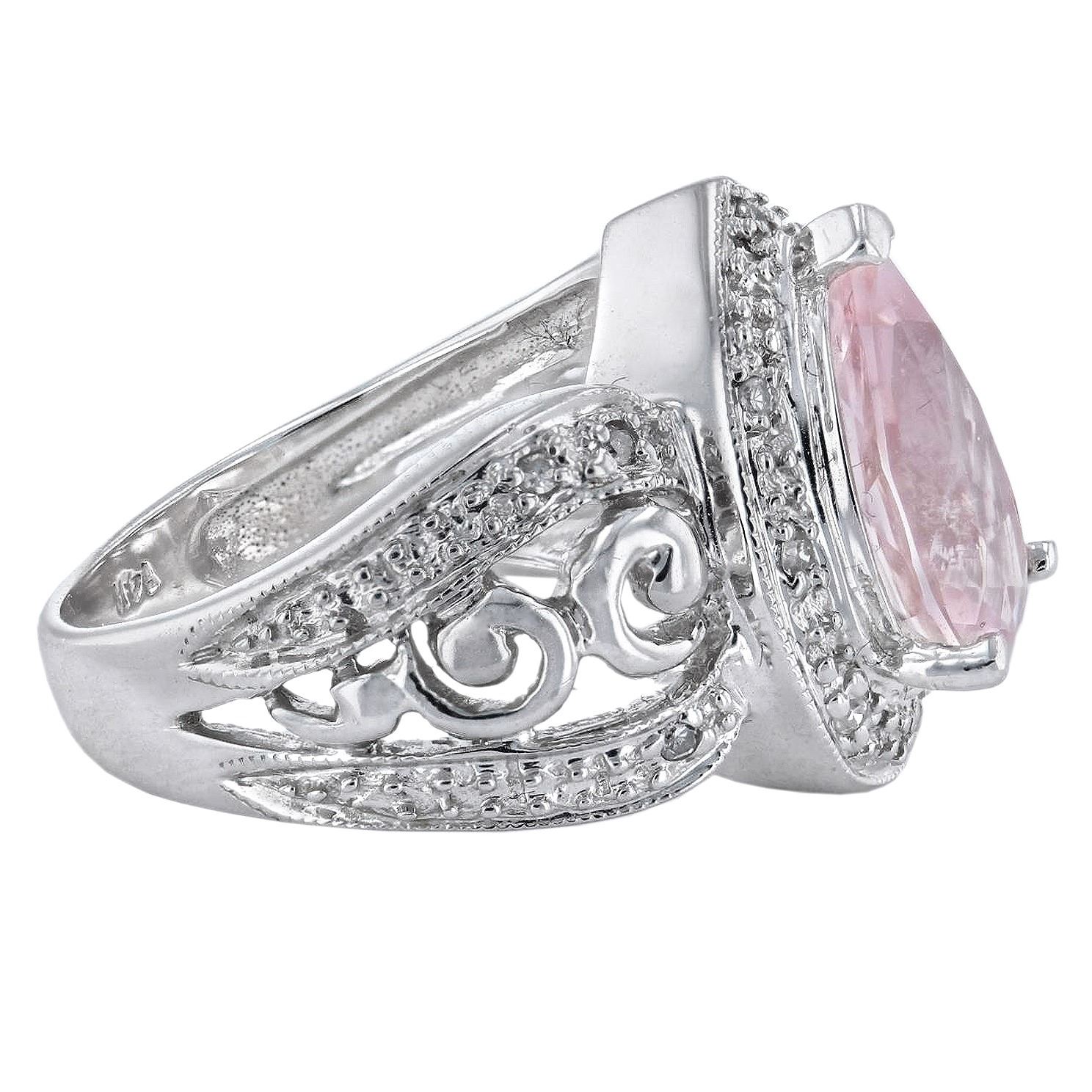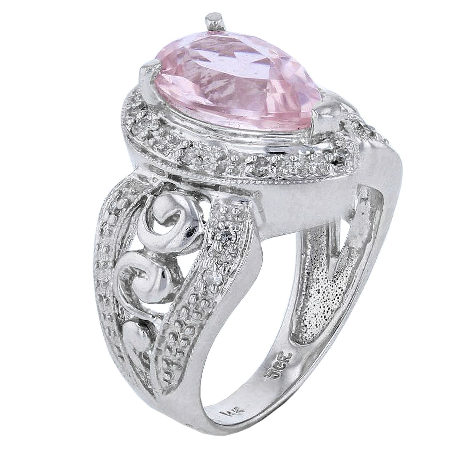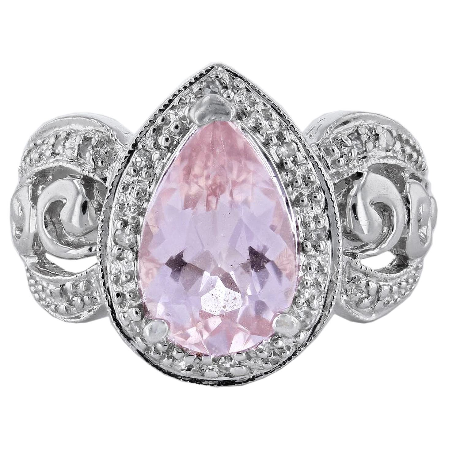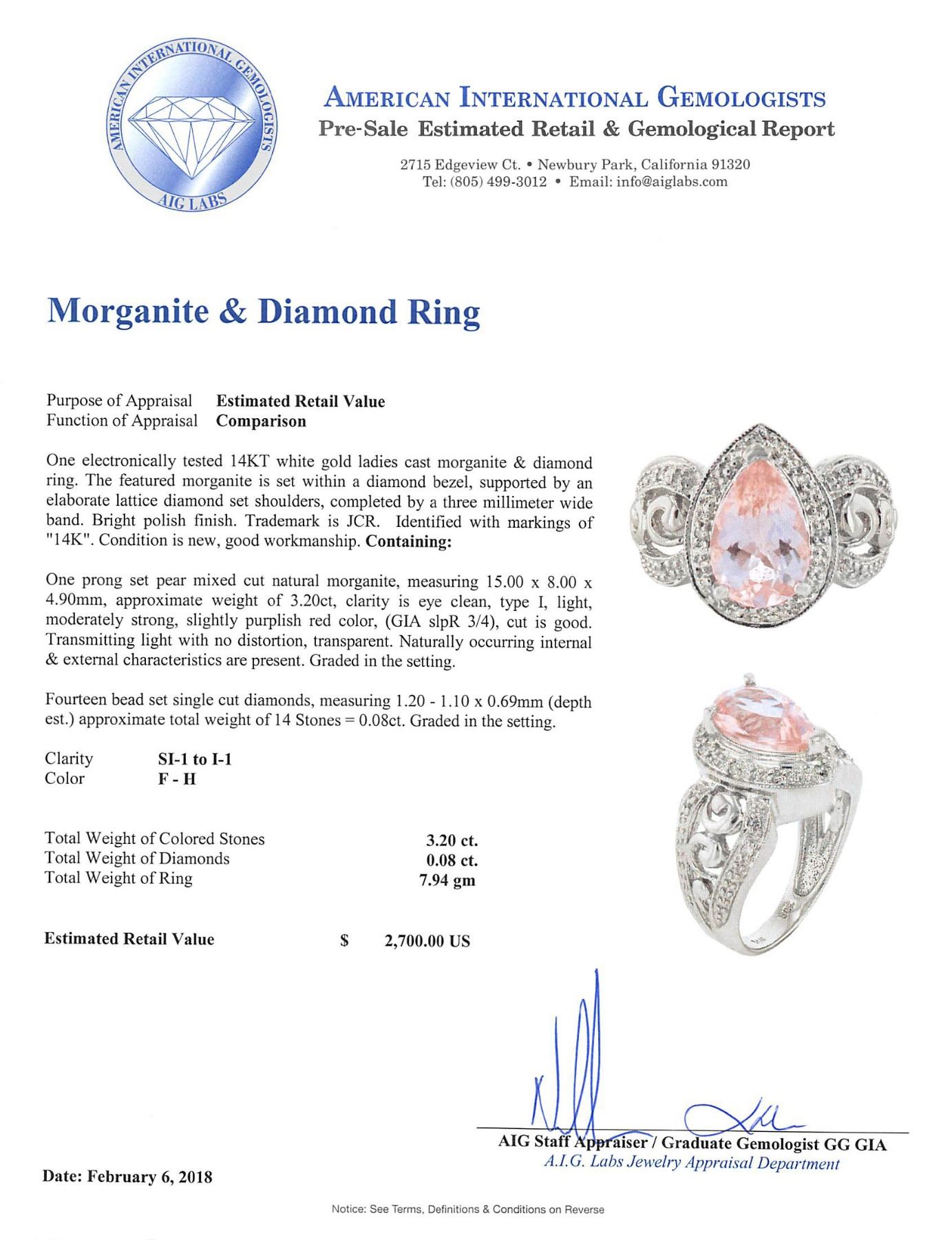 One 14KT White Gold 3.20ct Morganite and Diamond Ring. One electronically tested 14KT white gold ladies cast morganite & diamond ring. The featured morganite is set within a diamond bezel, supported by an elaborate lattice diamond set shoulders, completed by a three millimeter wide band. Bright polish finish. Trademark is JCR. Identified with markings of "14K". Condition is new, good workmanship. Containing: One prong set pear mixed cut natural morganite, measuring 15.00 x 8.00 x 4.90mm, approximate weight of 3.20ct., clarity is eye clean, type I, light, moderately strong, slightly purplish red color, (GIA slpR 3/4), cut is good. Transmitting light with no distortion, transparent. Naturally occurring internal & external characteristics are present. Graded in the setting. Fourteen bead set single cut diamonds, measuring 1.20 - 1.10 x 0.69mm (depth est.) approximate total weight of 14 Stones = 0.08ct. Graded in the setting. Clarity SI-1 to I-1, Color is F - H. Total Weight of Colored Stones 3.20 ct. Total Weight of Diamonds 0.08 ct. Total Weight of Ring 7.94 gm.
