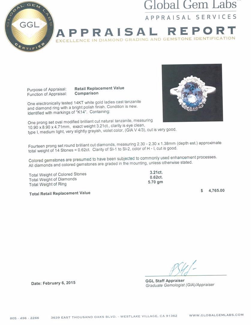 One electronically tested 14KT white gold ladies cast tanzanite and diamond ring with a bright polish finish. Identified with markings of "K14". Condition is new. Containing: One prong set oval modified brilliant cut natural tanzanite, measuring 10.90 x 8.90 x 4.71mm, exact weight 3.21ct., clarity is eye clean, type I, medium light, very slightly grayish, violet color, (GIA V 4/3), cut is very good. Fourteen prong set round brilliant cut diamonds, measuring 2.30 - 2.30 x 1.38mm (depth est.) approximate total weight of 14 Stones = 0.62ct. Clarity: SI-1 to SI-2. Color: H - I, Cut is Good. Colored gemstones are presumed to have been subjected to commonly used enhancement processes. All diamonds and colored gemstones are graded in the mounting, unless otherwise stated. Total Weight of Colored Stones 3.21ct. Total Weight of Diamonds 0.62ct. Total Weight of Ring 5.70 grams. GGL Appraised at $4,765.00.