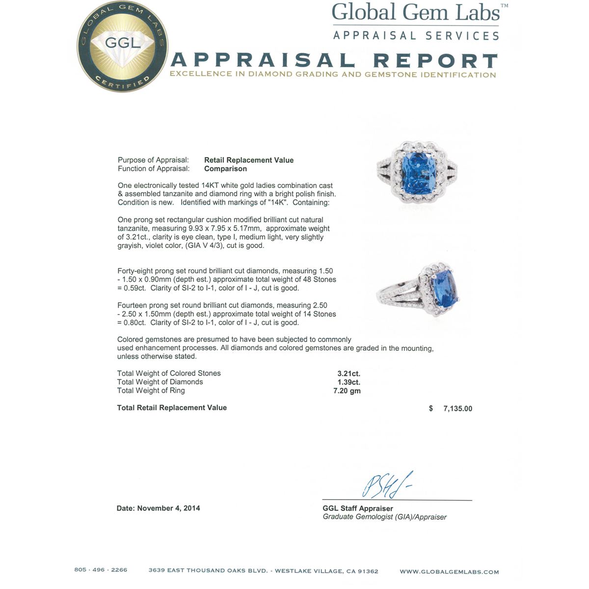 One electronically tested 14KT white gold ladies combination cast & assembled tanzanite and diamond ring with a bright polish finish. Identified with markings of "14K". Condition is new. Containing: One prong set rectangular cushion modified brilliant cut natural tanzanite, measuring 9.93 x 7.95 x 5.17mm, approximate weight of 3.21ct., clarity is eye clean, type I, medium light, very slightly grayish, violet color, (GIA V 4/3), cut is good. Forty-Eight prong set round brilliant cut diamonds, measuring 1.50 - 1.50 x 0.90mm (depth est.) approximate total weight of 48 Stones = 0.59ct. Clarity: SI-2 to I-1. Color: I - J, Cut is Good. Fourteen prong set round brilliant cut diamonds, measuring 2.50 - 2.50 x 1.50mm (depth est.) approximate total weight of 14 Stones = 0.80ct. Clarity: SI-2 to I-1. Color: I - J, Cut is Good. Colored gemstones are presumed to have been subjected to commonly used enhancement processes. All diamonds and colored gemstones are graded in the mounting, unless otherwise stated. Total Weight of Colored Stones 3.21ct. Total Weight of Diamonds 1.39ct. Total Weight of Ring 7.20 grams. GGL Appraised at $7,135.00.