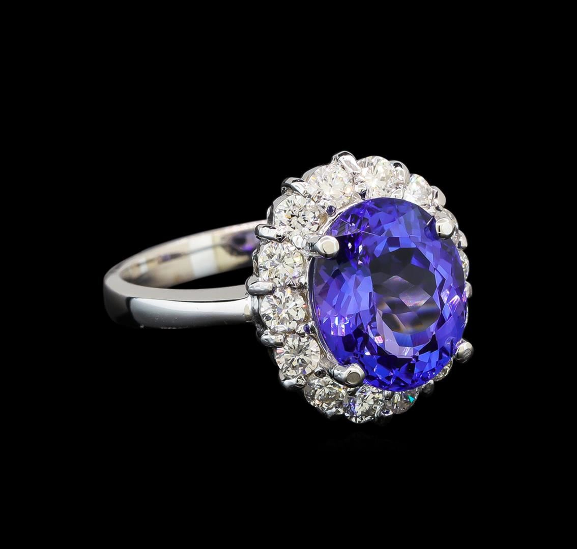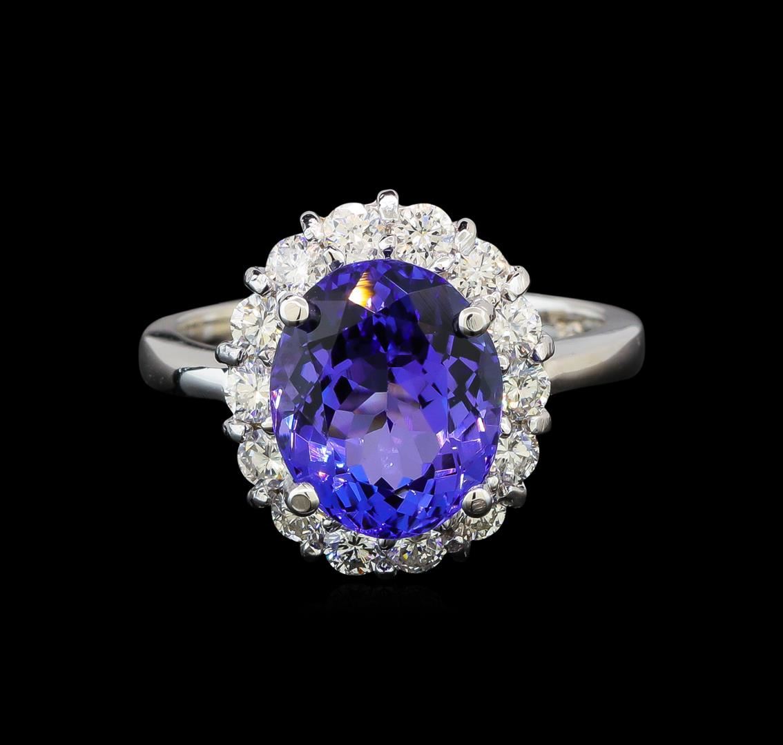One electronically tested 14KT white gold ladies cast tanzanite and diamond ring with a bright polish finish. Identified with markings of "K14". Condition is new. Containing: One prong set oval modified brilliant cut natural tanzanite, measuring 10.90 x 8.90 x 4.71mm, exact weight 3.21ct., clarity is eye clean, type I, medium light, very slightly grayish, violet color, (GIA V 4/3), cut is very good. Fourteen prong set round brilliant cut diamonds, measuring 2.30 - 2.30 x 1.38mm (depth est.) approximate total weight of 14 Stones = 0.62ct. Clarity: SI-1 to SI-2. Color: H - I, Cut is Good. Colored gemstones are presumed to have been subjected to commonly used enhancement processes. All diamonds and colored gemstones are graded in the mounting, unless otherwise stated. Total Weight of Colored Stones 3.21ct. Total Weight of Diamonds 0.62ct. Total Weight of Ring 5.70 grams. GGL Appraised at $4,765.00.