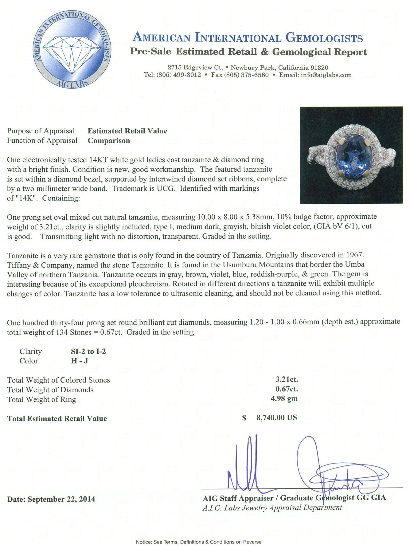 One electronically tested 14KT white gold ladies cast tanzanite & diamond ring with a bright finish. The featured tanzanite is set within a diamond bezel, supported by intertwined diamond set ribbons, complete by a two millimeter wide band. Trademark is UCG. Identified with markings of "14K". Condition is new, good workmanship. Containing: One prong set oval mixed cut natural tanzanite, measuring 10.00 x 8.00 x 5.38mm, 10% bulge factor, approximate weight of 3.21ct., clarity is slightly included, type I, medium dark, grayish, bluish violet color, (GIA bV 6/1), cut is good. Transmitting light with no distortion, transparent. Graded in the setting. Tanzanite is a very rare gemstone that is only found in the country of Tanzania. Originally discovered in 1967. Tiffany & Company, named the stone Tanzanite. It is found in the Usumburu Mountains that border the Umba Valley of northern Tanzania. Tanzanite occurs in gray, brown, violet, blue, reddish-purple, & green. The gem is interesting because of its exceptional pleochroism. Rotated in different directions a tanzanite will exhibit multiple changes of color. Tanzanite has a low tolerance to ultrasonic cleaning, and should not be cleaned using this method. One Hundred Thirty-Four prong set round brilliant cut diamonds, measuring 1.20 - 1.00 x 0.66mm (depth est.) approximate total weight of 134 Stones = 0.67ct. Graded in the setting. Clarity: SI-2 to I-2. Color: H - J. Total Weight of Colored Stones 3.21ct. Total Weight of Diamonds 0.67ct. Total Weight of Ring 4.98 grams. AIG Appraised.