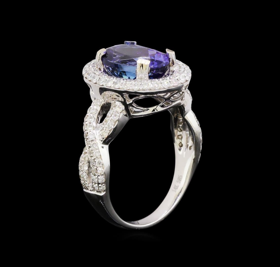 One electronically tested 14KT white gold ladies cast tanzanite & diamond ring with a bright finish. The featured tanzanite is set within a diamond bezel, supported by intertwined diamond set ribbons, complete by a two millimeter wide band. Trademark is UCG. Identified with markings of "14K". Condition is new, good workmanship. Containing: One prong set oval mixed cut natural tanzanite, measuring 10.00 x 8.00 x 5.38mm, 10% bulge factor, approximate weight of 3.21ct., clarity is slightly included, type I, medium dark, grayish, bluish violet color, (GIA bV 6/1), cut is good. Transmitting light with no distortion, transparent. Graded in the setting. Tanzanite is a very rare gemstone that is only found in the country of Tanzania. Originally discovered in 1967. Tiffany & Company, named the stone Tanzanite. It is found in the Usumburu Mountains that border the Umba Valley of northern Tanzania. Tanzanite occurs in gray, brown, violet, blue, reddish-purple, & green. The gem is interesting because of its exceptional pleochroism. Rotated in different directions a tanzanite will exhibit multiple changes of color. Tanzanite has a low tolerance to ultrasonic cleaning, and should not be cleaned using this method. One Hundred Thirty-Four prong set round brilliant cut diamonds, measuring 1.20 - 1.00 x 0.66mm (depth est.) approximate total weight of 134 Stones = 0.67ct. Graded in the setting. Clarity: SI-2 to I-2. Color: H - J. Total Weight of Colored Stones 3.21ct. Total Weight of Diamonds 0.67ct. Total Weight of Ring 4.98 grams. AIG Appraised.