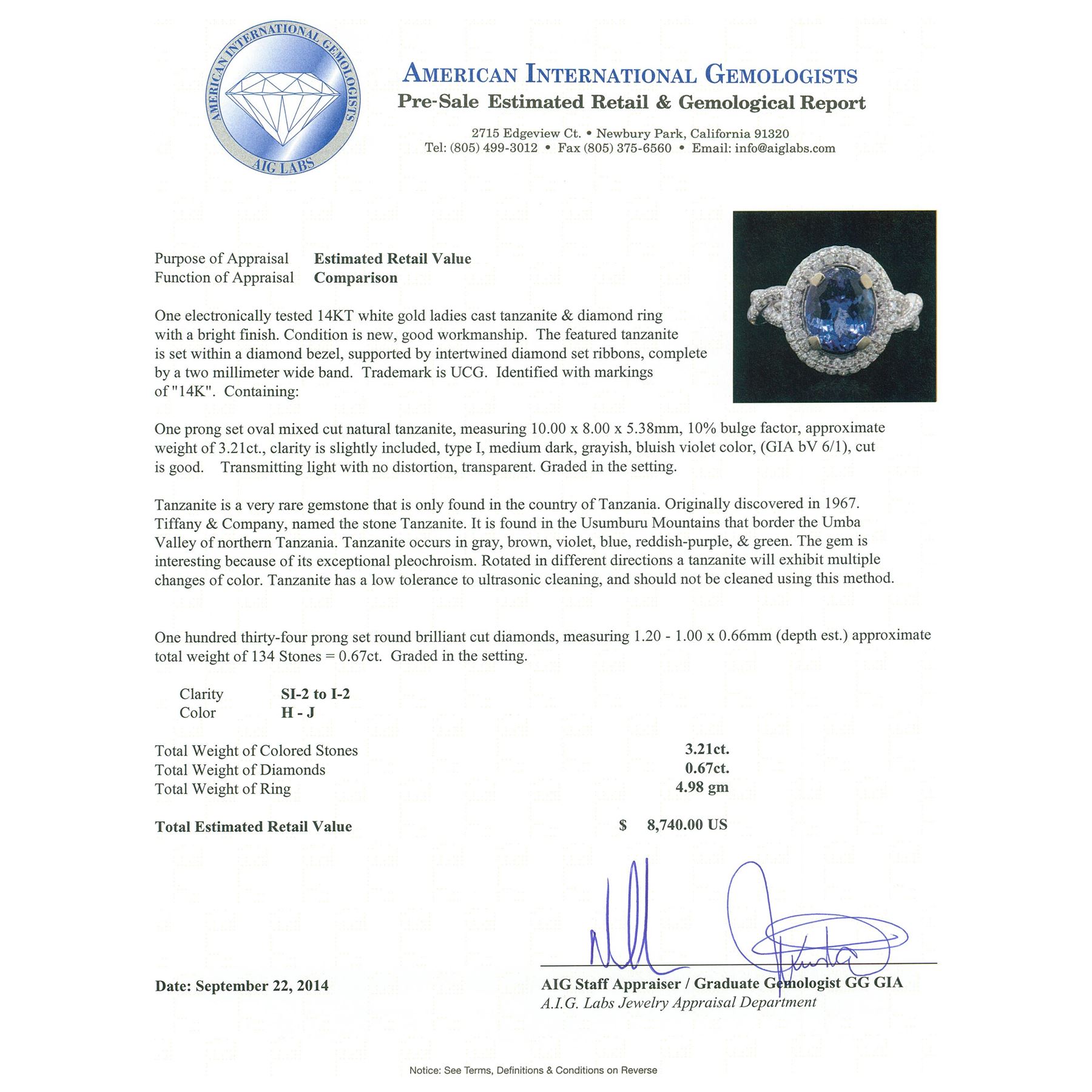 One electronically tested 14KT white gold ladies cast tanzanite & diamond ring with a bright finish. The featured tanzanite is set within a diamond bezel, supported by intertwined diamond set ribbons, complete by a two millimeter wide band. Trademark is UCG. Identified with markings of "14K". Condition is new, good workmanship. Containing: One prong set oval mixed cut natural tanzanite, measuring 10.00 x 8.00 x 5.38mm, 10% bulge factor, approximate weight of 3.21ct., clarity is slightly included, type I, medium dark, grayish, bluish violet color, (GIA bV 6/1), cut is good. Transmitting light with no distortion, transparent. Graded in the setting. Tanzanite is a very rare gemstone that is only found in the country of Tanzania. Originally discovered in 1967. Tiffany & Company, named the stone Tanzanite. It is found in the Usumburu Mountains that border the Umba Valley of northern Tanzania. Tanzanite occurs in gray, brown, violet, blue, reddish-purple, & green. The gem is interesting because of its exceptional pleochroism. Rotated in different directions a tanzanite will exhibit multiple changes of color. Tanzanite has a low tolerance to ultrasonic cleaning, and should not be cleaned using this method. One Hundred Thirty-Four prong set round brilliant cut diamonds, measuring 1.20 - 1.00 x 0.66mm (depth est.) approximate total weight of 134 Stones = 0.67ct. Graded in the setting. Clarity: SI-2 to I-2. Color: H - J. Total Weight of Colored Stones 3.21ct. Total Weight of Diamonds 0.67ct. Total Weight of Ring 4.98 grams. AIG Appraised.