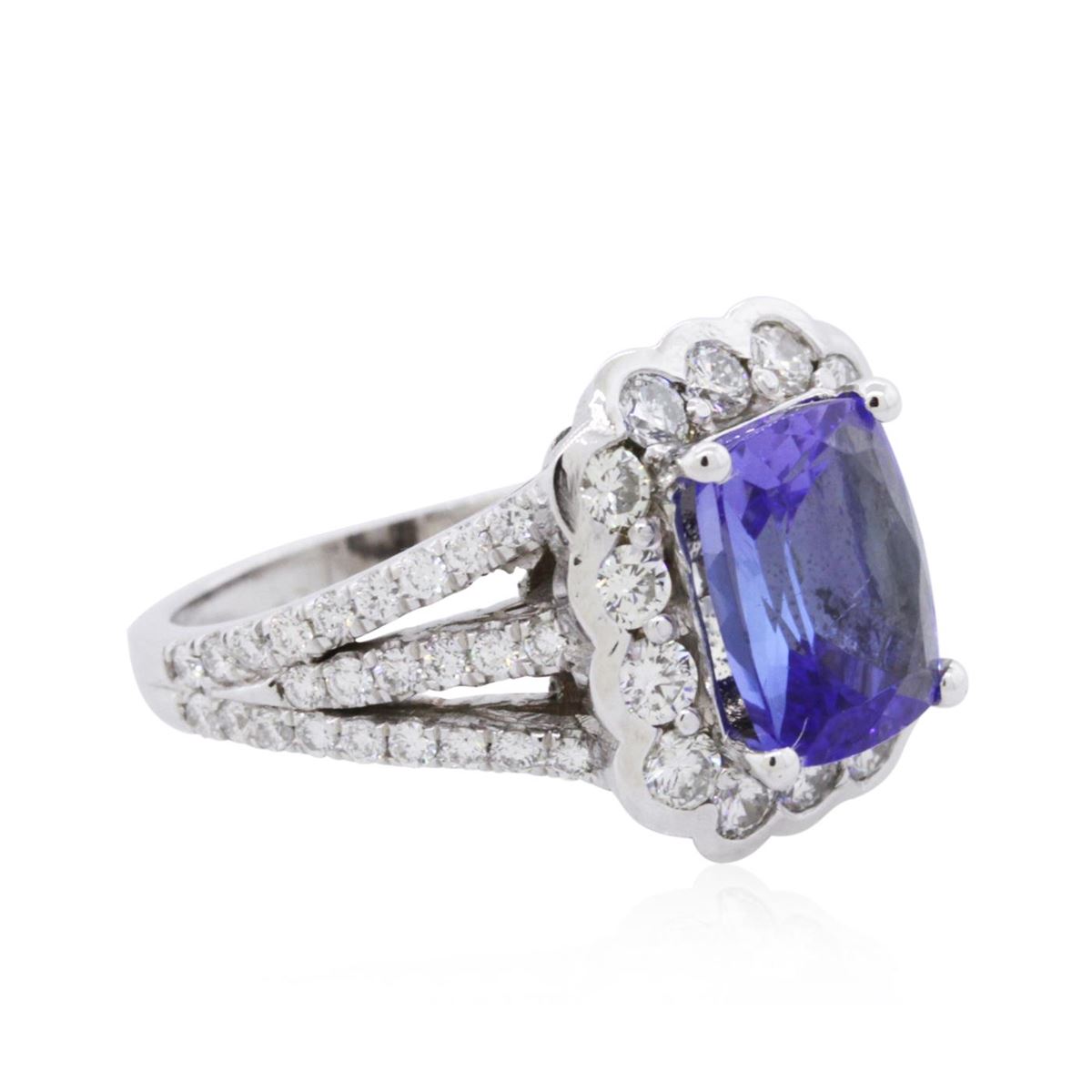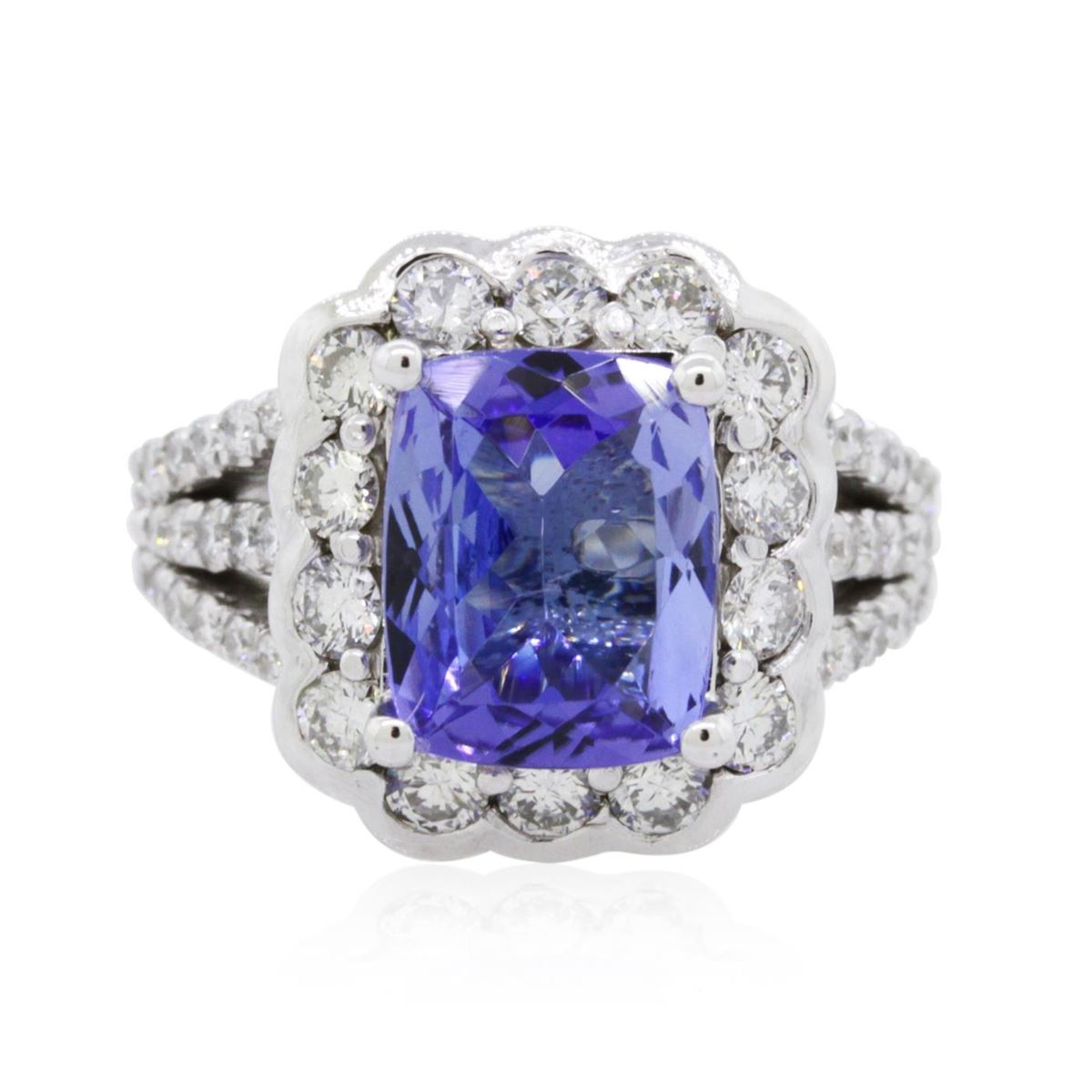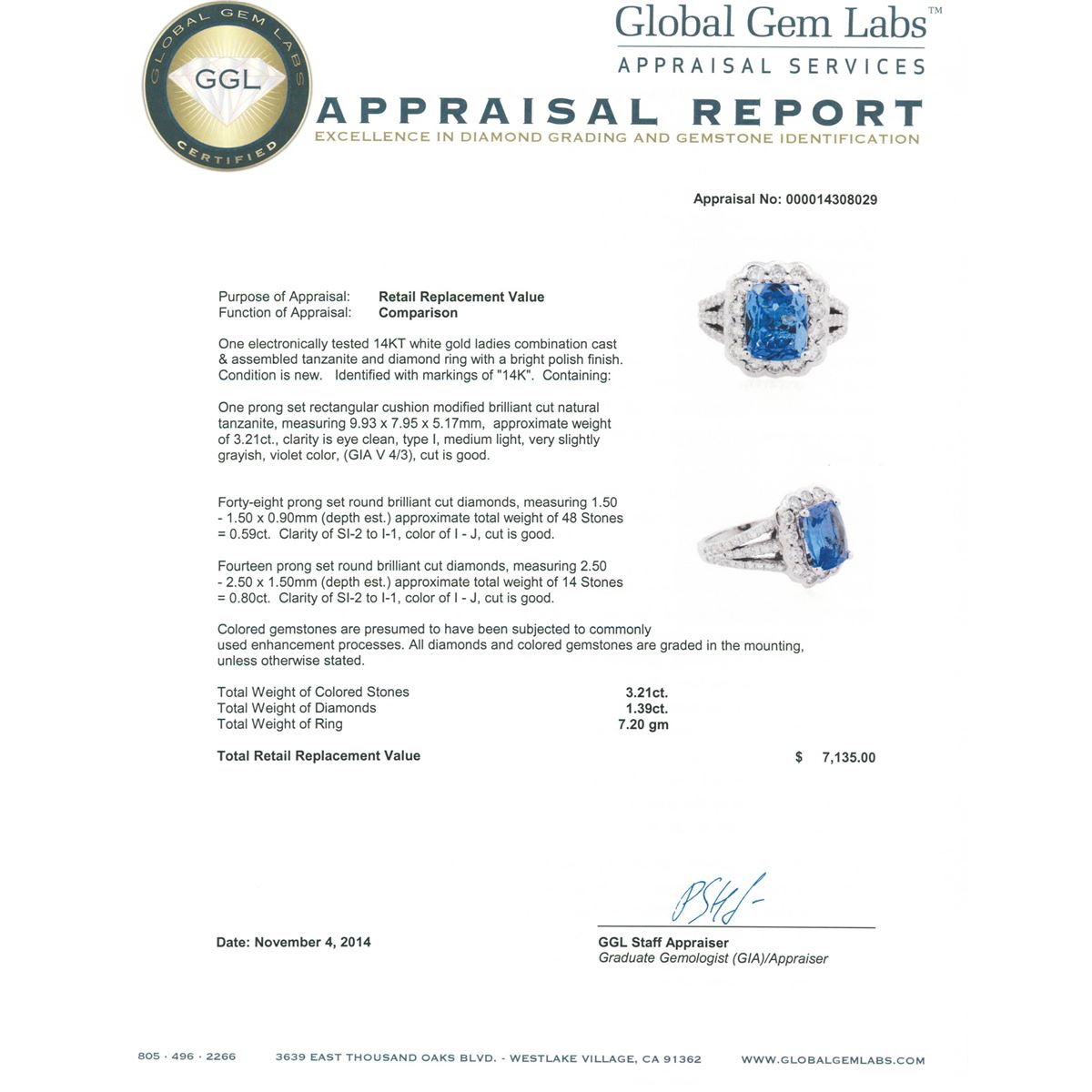 One electronically tested 14KT white gold ladies combination cast & assembled tanzanite and diamond ring with a bright polish finish. Identified with markings of "14K". Condition is new. Containing: One prong set rectangular cushion modified brilliant cut natural tanzanite, measuring 9.93 x 7.95 x 5.17mm, approximate weight of 3.21ct., clarity is eye clean, type I, medium light, very slightly grayish, violet color, (GIA V 4/3), cut is good. Forty-Eight prong set round brilliant cut diamonds, measuring 1.50 - 1.50 x 0.90mm (depth est.) approximate total weight of 48 Stones = 0.59ct. Clarity: SI-2 to I-1. Color: I - J, Cut is Good. Fourteen prong set round brilliant cut diamonds, measuring 2.50 - 2.50 x 1.50mm (depth est.) approximate total weight of 14 Stones = 0.80ct. Clarity: SI-2 to I-1. Color: I - J, Cut is Good. Colored gemstones are presumed to have been subjected to commonly used enhancement processes. All diamonds and colored gemstones are graded in the mounting, unless otherwise stated. Total Weight of Colored Stones 3.21ct. Total Weight of Diamonds 1.39ct. Total Weight of Ring 7.20 grams. GGL Appraised at $7,135.00.