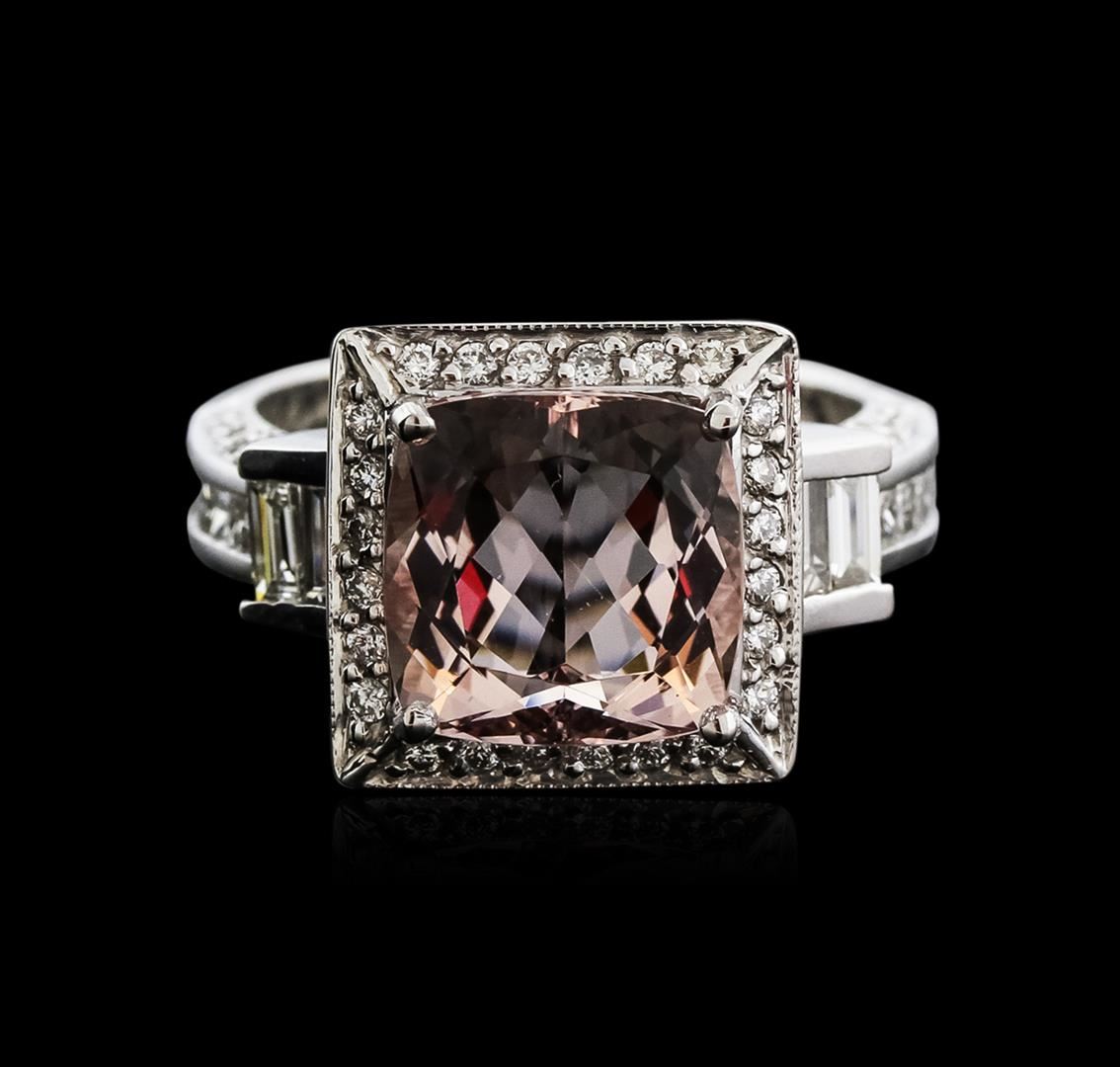 One electronically tested 14KT white gold ladies cast morganite and diamond ring with a flat shank with a bright polish finish. Identified with markings of "14K". Condition is new. Containing: One prong set square cushion modified brilliant cut natural morganite, measuring 9.68 x 9.67 x 5.40mm, approximate weight of 3.23ct., clarity is eye clean, type I, light, very slightly brownish, reddish orange color, (GIA rO 3/3), cut is good. Ten channel set princess cut diamonds, measuring 1.50 x 1.50 x 1.13mm (depth est.) approximate total weight of 10 Stones = 0.21ct. Clarity: VS-2 to SI-1. Color: I - J, Cut is Good. Four prong set baguette cut diamonds, measuring 3.00 x 1.80 x 1.53mm (depth est.) approximate total weight of 4 Stones = 0.30ct. Clarity: VS-2. Color: H - I, Cut is Good. Fifty-Seven prong set round brilliant cut diamonds, measuring 1.30 - 1.30 x 0.78mm (depth est.) approximate total weight of 57 Stones = 0.46ct. Clarity: SI-1. Color: H - I, Cut is Good. All diamonds and colored gemstones are graded in the mounting, unless otherwise stated. Colored gemstones are presumed to have been subjected to commonly used enhancement processes. Total Weight of Colored Stones 3.23ct. Total Weight of Diamonds 0.97ct. Total Weight of Ring 8.60 grams. GGL Appraised at $4,655.00.