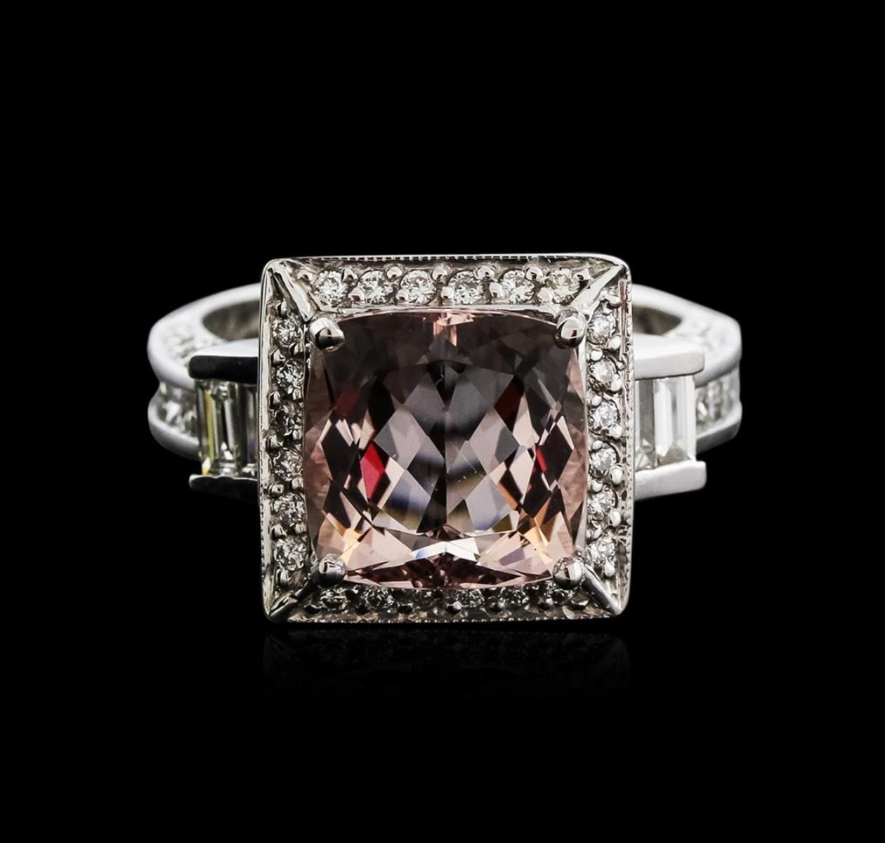 One electronically tested 14KT white gold ladies cast morganite and diamond ring with a flat shank with a bright polish finish. Identified with markings of "14K". Condition is new. Containing: One prong set square cushion modified brilliant cut natural morganite, measuring 9.68 x 9.67 x 5.40mm, approximate weight of 3.23ct., clarity is eye clean, type I, light, very slightly brownish, reddish orange color, (GIA rO 3/3), cut is good. Ten channel set princess cut diamonds, measuring 1.50 x 1.50 x 1.13mm (depth est.) approximate total weight of 10 Stones = 0.21ct. Clarity: VS-2 to SI-1. Color: I - J, Cut is Good. Four prong set baguette cut diamonds, measuring 3.00 x 1.80 x 1.53mm (depth est.) approximate total weight of 4 Stones = 0.30ct. Clarity: VS-2. Color: H - I, Cut is Good. Fifty-Seven prong set round brilliant cut diamonds, measuring 1.30 - 1.30 x 0.78mm (depth est.) approximate total weight of 57 Stones = 0.46ct. Clarity: SI-1. Color: H - I, Cut is Good. All diamonds and colored gemstones are graded in the mounting, unless otherwise stated. Colored gemstones are presumed to have been subjected to commonly used enhancement processes. Total Weight of Colored Stones 3.23ct. Total Weight of Diamonds 0.97ct. Total Weight of Ring 8.60 grams. GGL Appraised.