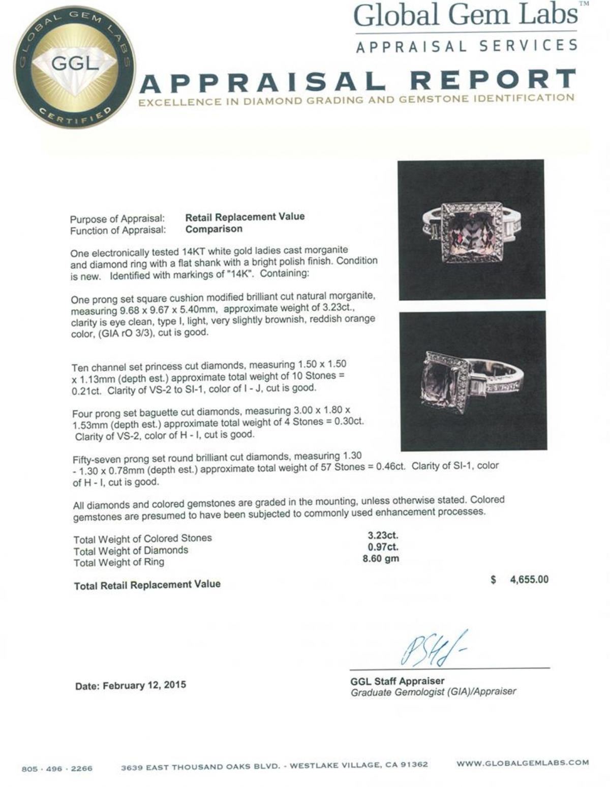 One electronically tested 14KT white gold ladies cast morganite and diamond ring with a flat shank with a bright polish finish. Identified with markings of "14K". Condition is new. Containing: One prong set square cushion modified brilliant cut natural morganite, measuring 9.68 x 9.67 x 5.40mm, approximate weight of 3.23ct., clarity is eye clean, type I, light, very slightly brownish, reddish orange color, (GIA rO 3/3), cut is good. Ten channel set princess cut diamonds, measuring 1.50 x 1.50 x 1.13mm (depth est.) approximate total weight of 10 Stones = 0.21ct. Clarity: VS-2 to SI-1. Color: I - J, Cut is Good. Four prong set baguette cut diamonds, measuring 3.00 x 1.80 x 1.53mm (depth est.) approximate total weight of 4 Stones = 0.30ct. Clarity: VS-2. Color: H - I, Cut is Good. Fifty-Seven prong set round brilliant cut diamonds, measuring 1.30 - 1.30 x 0.78mm (depth est.) approximate total weight of 57 Stones = 0.46ct. Clarity: SI-1. Color: H - I, Cut is Good. All diamonds and colored gemstones are graded in the mounting, unless otherwise stated. Colored gemstones are presumed to have been subjected to commonly used enhancement processes. Total Weight of Colored Stones 3.23ct. Total Weight of Diamonds 0.97ct. Total Weight of Ring 8.60 grams. GGL Appraised.