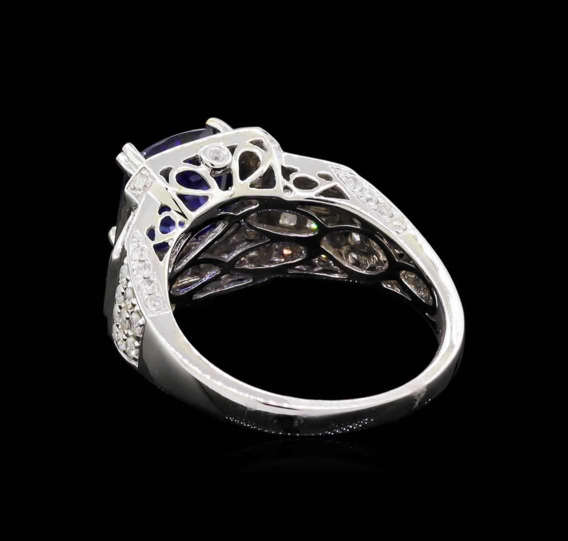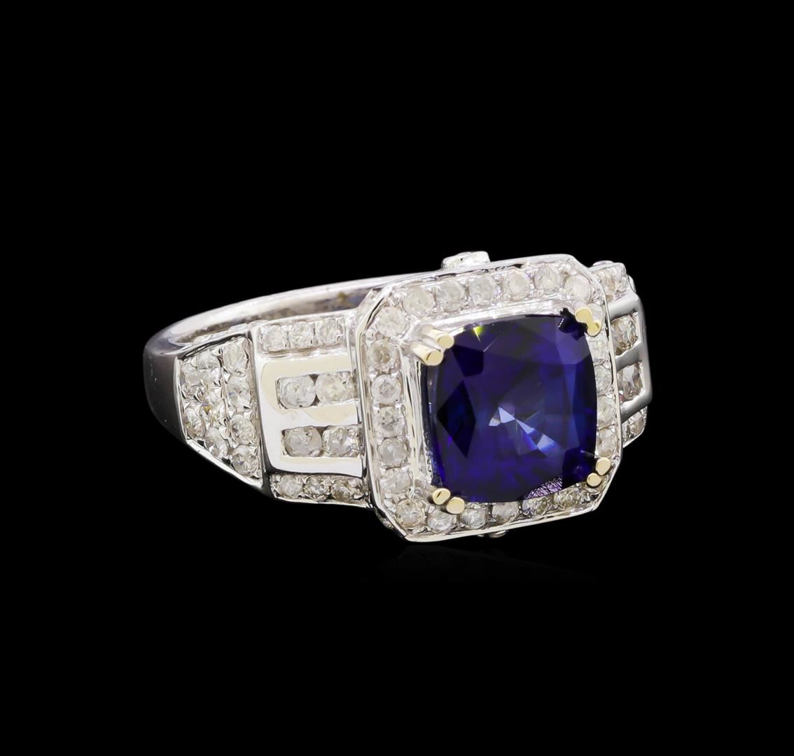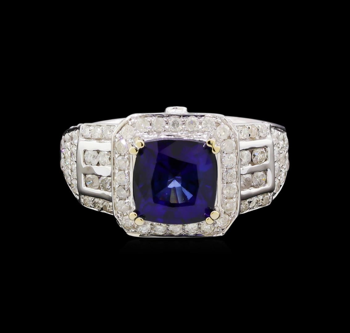 One electronically tested 14KT white gold ladies cast sapphire & diamond ring with a bright finish. The featured sapphire is set within a diamond bezel, supported by an elaborate white gold lattice under gallery and tapering diamond set shoulders, completed by a two millimeter wide band. Trademark is Orianne. Identified with markings of "14K". Condition is new, good workmanship. Containing: One prong set square cushion mixed cut natural blue sapphire, measuring 8.00 x 7.80 x 5.25mm, 5% bulge factor, approximate weight of 3.23ct., clarity is eye clean, type II, dark, moderately strong, blue color, (GIA B 7/4), cut is good. Transmitting light with no distortion, transparent. Naturally occurring internal characteristics are present. Indications of laboratory high temperature lattice diffusion treatment. Graded in the setting. Eighty-Four channel and prong set round brilliant cut diamonds, measuring 1.50 - 1.00 x 0.75mm (depth est.) approximate total weight of 84 Stones = 0.60ct. Graded in the setting. Clarity: I-2 to I-3. Color: H - I. Total Weight of Colored Stones 3.23ct. Total Weight of Diamonds 0.60ct. Total Weight of Ring 5.81 grams. AIG Appraised at $3,050.00.