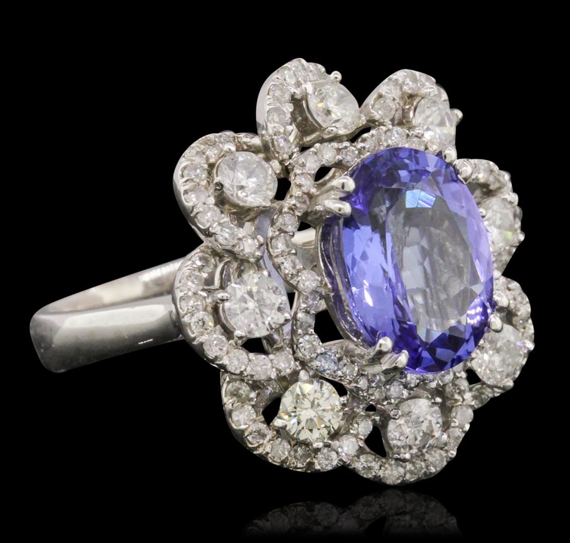 One electronically tested 14KT white gold ladies combination cast & assembled ring with a bright polish finish. Condition is new. Identified with markings of "K14". Containing: One prong set oval modified brilliant cut natural tanzanite, measuring 11.28 x 8.57 x 4.89mm, approximate weight of 3.23ct., clarity is eye clean, type I, medium light, moderately strong, bluish violet color, (GIA bV 4/4), cut is good. Eight prong set round brilliant cut diamonds, measuring 3.00 - 3.00 x 1.80mm (depth est.) approximate. Total Weight of 8 Stones = 0.79ct. Clarity: I-1 to I-2. Color: J, Cut is Good. One Hundred Four prong set round brilliant cut diamonds, measuring 1.10 - 1.10 x 0.66mm (depth est.) approximate. Total Weight of 104 Stones = 0.50ct. Clarity: I-1 to I-2. Color: I - J, Cut is Good. Colored gemstones are presumed to have been subjected to commonly used enhancement processes. All diamonds and colored gemstones are graded in the mounting, unless otherwise stated. Total Weight of Colored Stones 3.23ct. Total Weight of Diamonds 1.29ct. Total Weight of Ring 8.40 grams. GGL Appraised at $9,625.00.