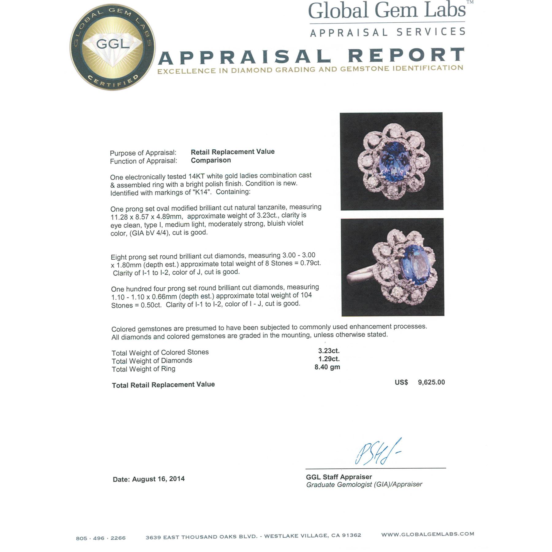 One electronically tested 14KT white gold ladies combination cast & assembled ring with a bright polish finish. Condition is new. Identified with markings of "K14". Containing: One prong set oval modified brilliant cut natural tanzanite, measuring 11.28 x 8.57 x 4.89mm, approximate weight of 3.23ct., clarity is eye clean, type I, medium light, moderately strong, bluish violet color, (GIA bV 4/4), cut is good. Eight prong set round brilliant cut diamonds, measuring 3.00 - 3.00 x 1.80mm (depth est.) approximate. Total Weight of 8 Stones = 0.79ct. Clarity: I-1 to I-2. Color: J, Cut is Good. One Hundred Four prong set round brilliant cut diamonds, measuring 1.10 - 1.10 x 0.66mm (depth est.) approximate. Total Weight of 104 Stones = 0.50ct. Clarity: I-1 to I-2. Color: I - J, Cut is Good. Colored gemstones are presumed to have been subjected to commonly used enhancement processes. All diamonds and colored gemstones are graded in the mounting, unless otherwise stated. Total Weight of Colored Stones 3.23ct. Total Weight of Diamonds 1.29ct. Total Weight of Ring 8.40 grams. GGL Appraised at $9,625.00.
